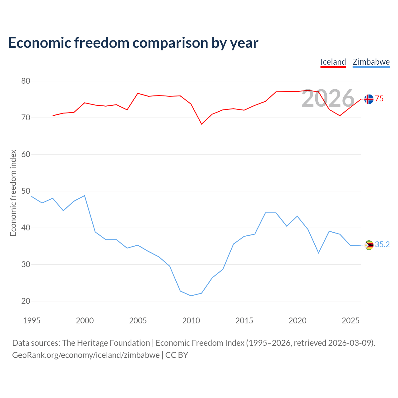The Economic Freedom Index for Iceland is 75, ranking 19/197, compared to 35.2 for Zimbabwe, ranking 190/197. The chart above displays a comparison of annual changes in economic freedom indexes.