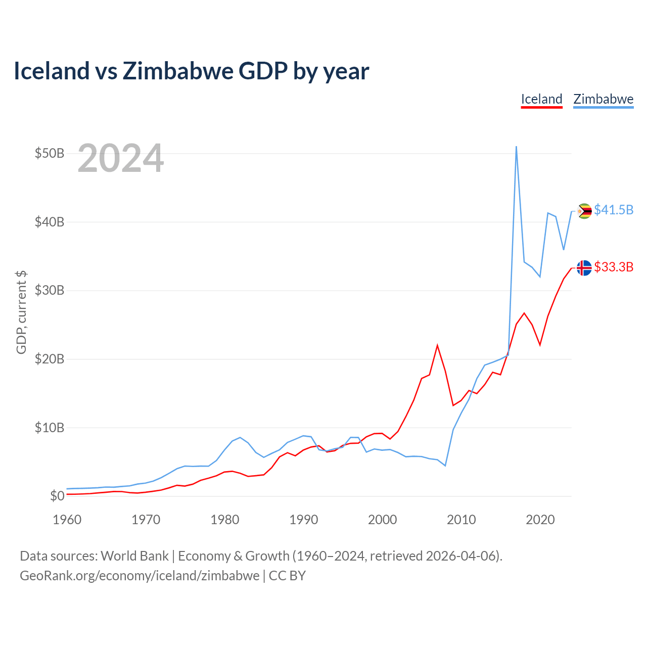 Iceland vs Zimbabwe GDP by year