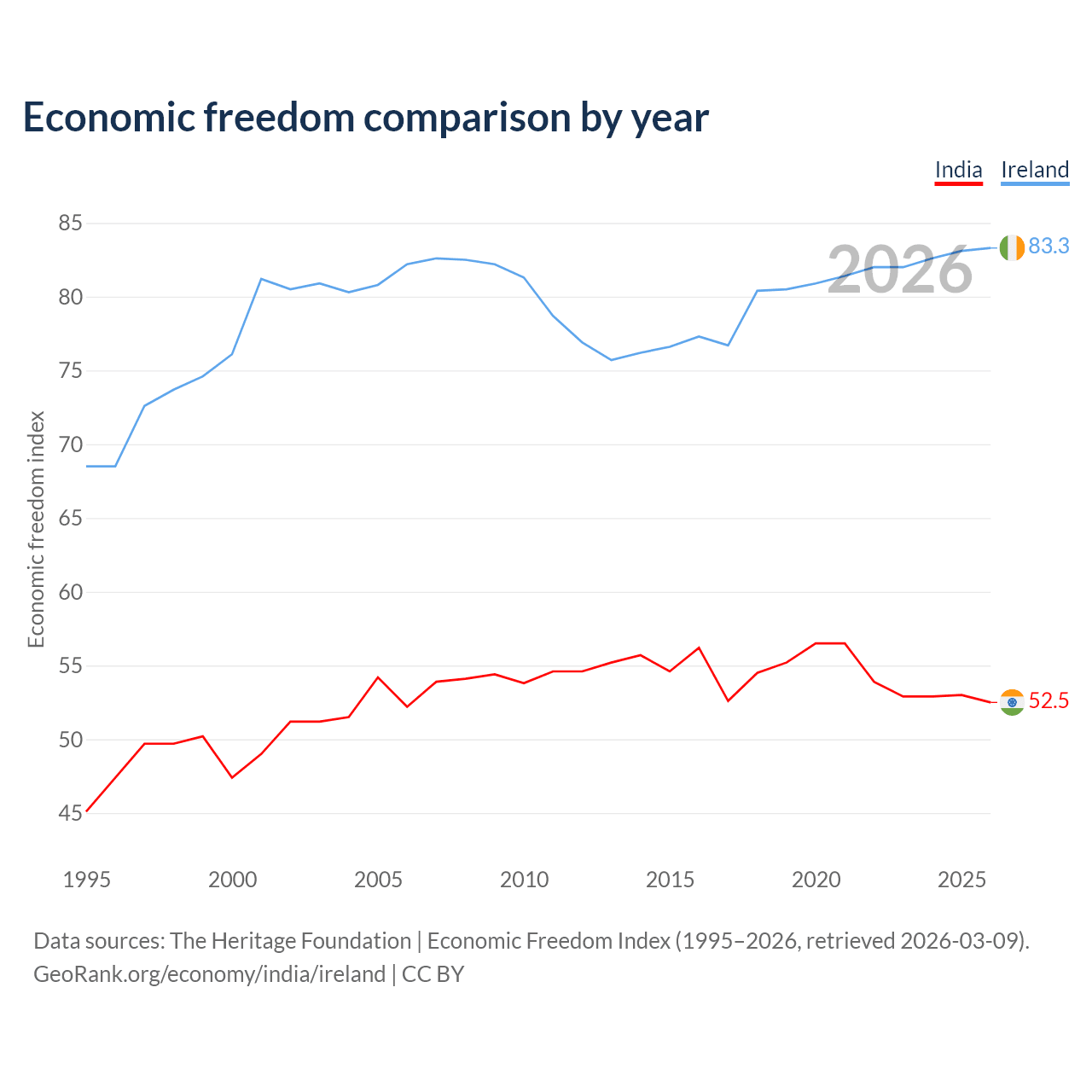 The Economic Freedom Index for India is 52.5, ranking 146/197, compared to 83.3 for Ireland, ranking 3/197. The chart above displays a comparison of annual changes in economic freedom indexes.