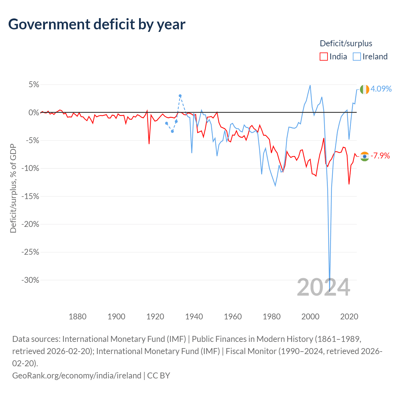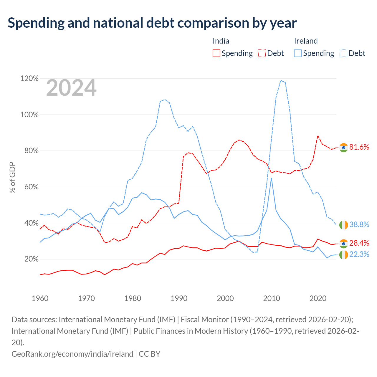 India has $3.19T in government debt (81.6% of GDP), compared to $236B (38.8% of GDP) in Ireland.
