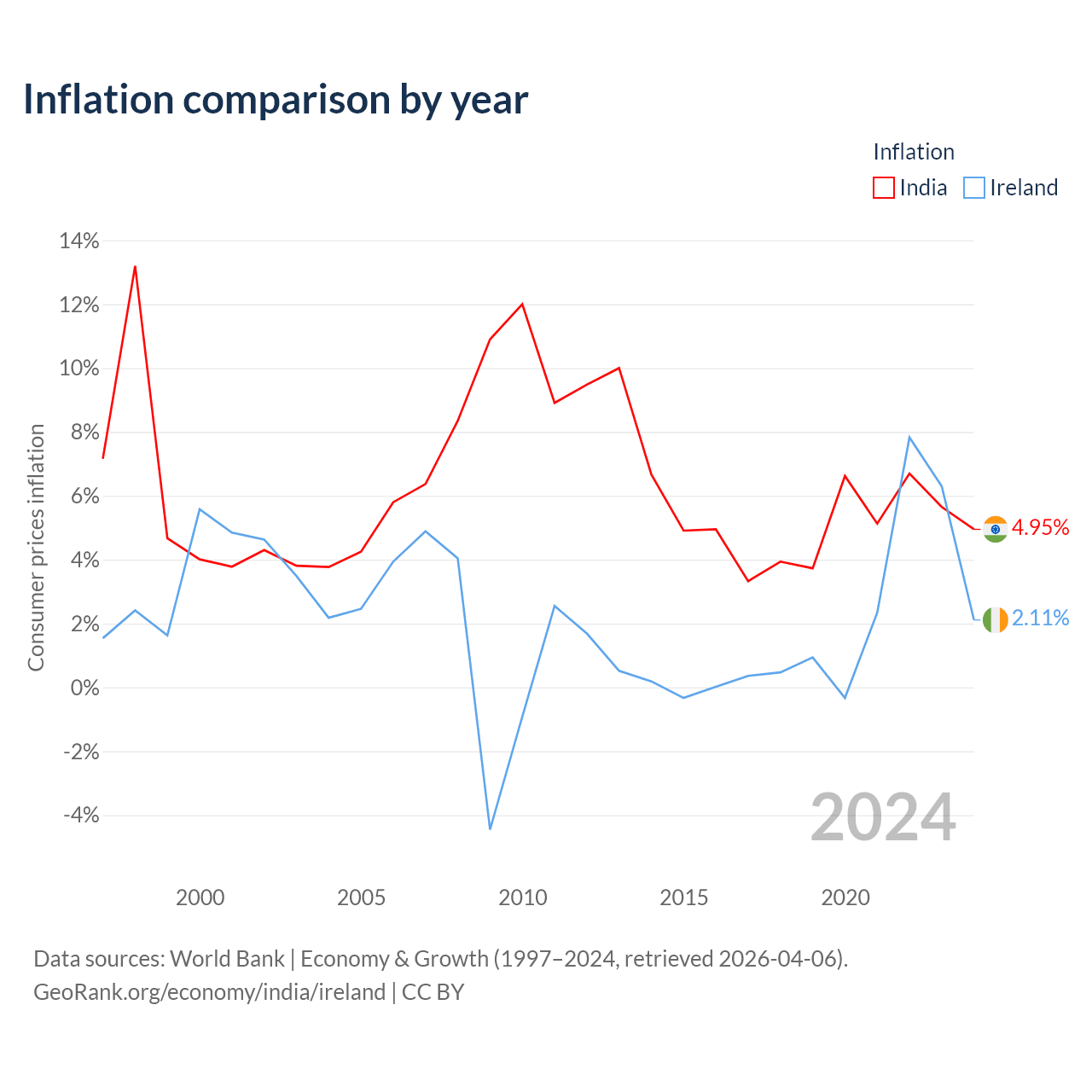 India has a GDP of $3.91T compared to $609B for Ireland, ranking 5/197 and 25/197 by economy size, respectively.