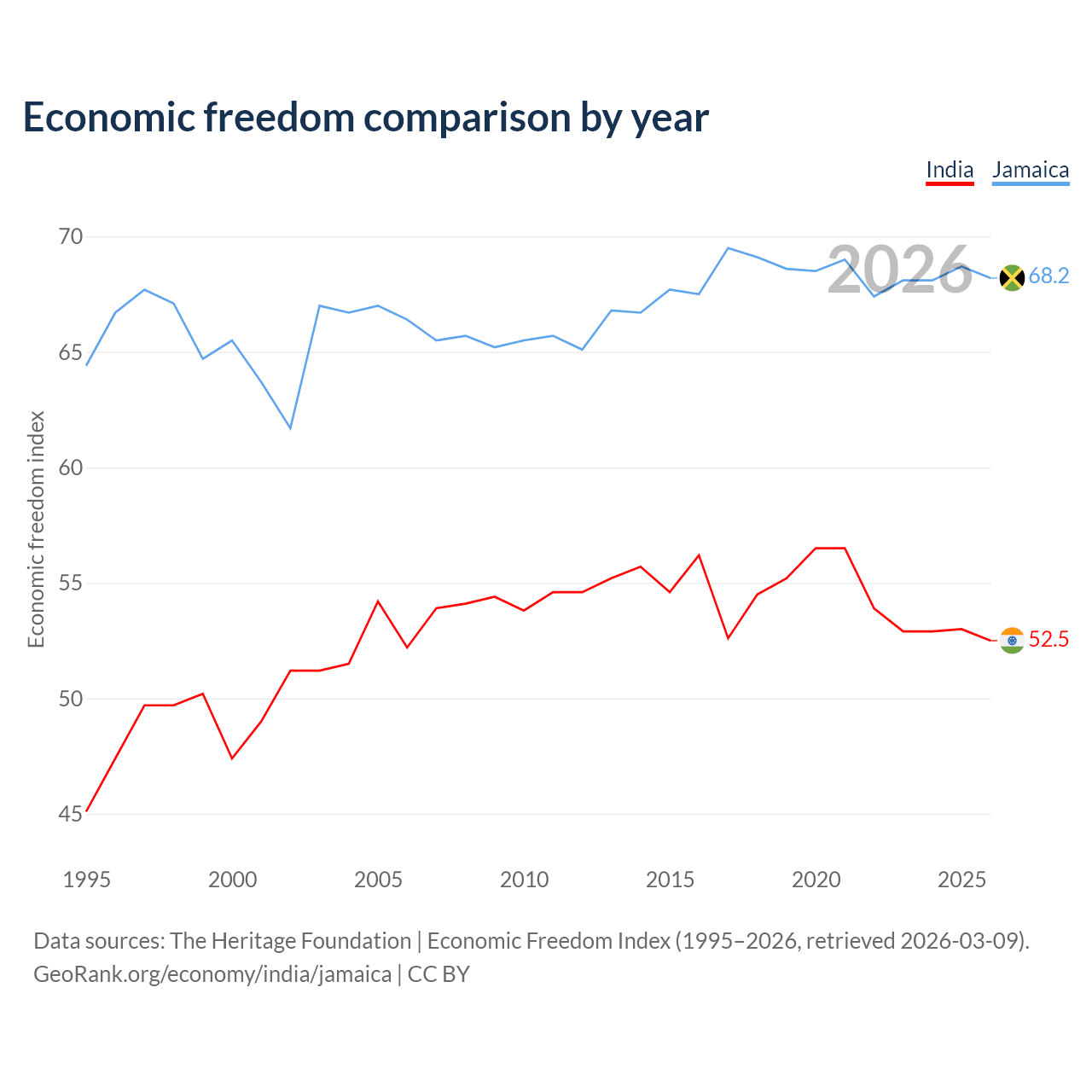 The Economic Freedom Index for India is 52.5, ranking 146/197, compared to 68.2 for Jamaica, ranking 48/197. The chart above displays a comparison of annual changes in economic freedom indexes.