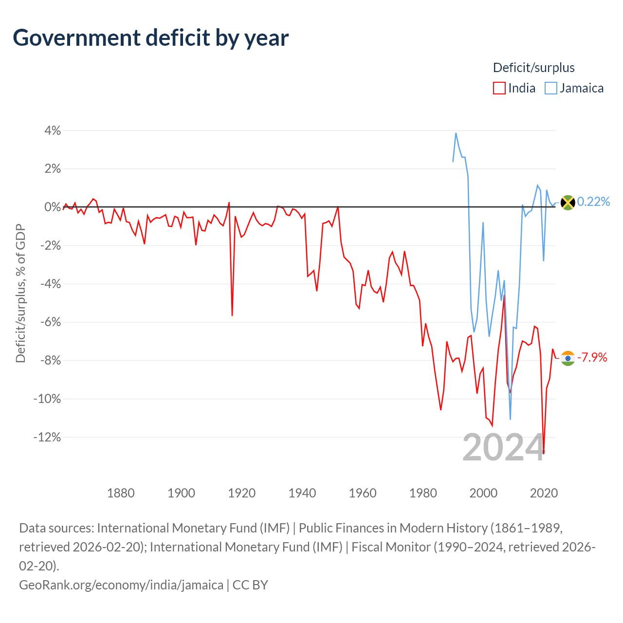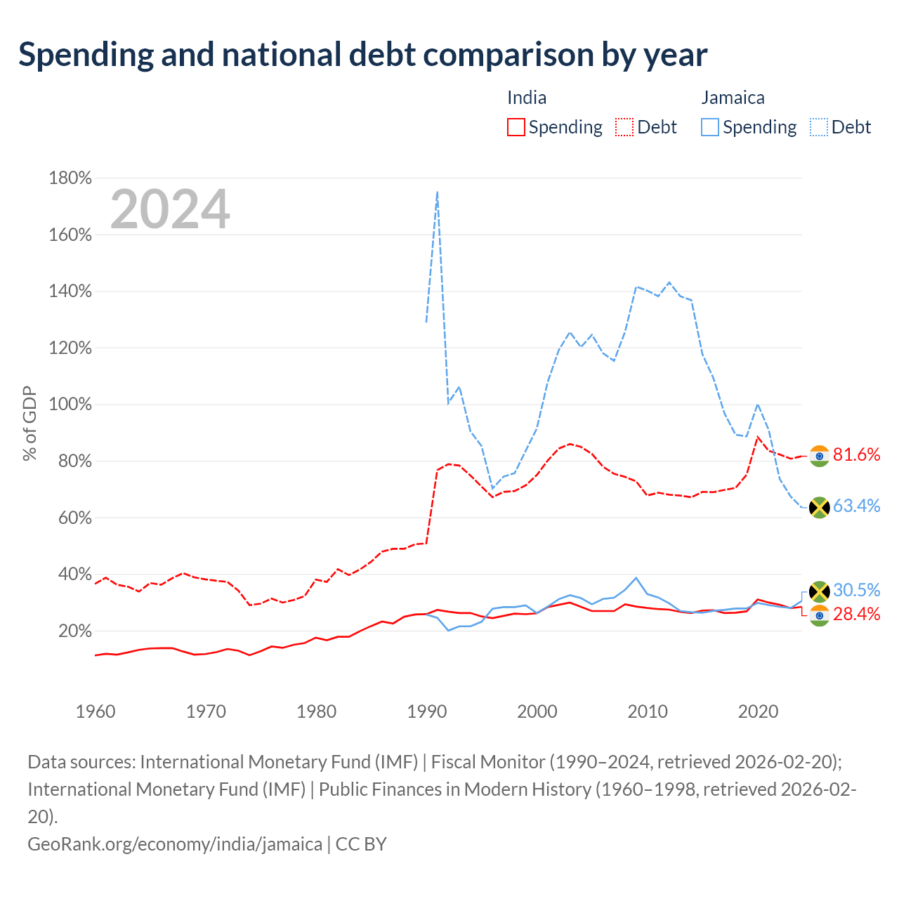 India has $3.19T in government debt (81.6% of GDP), compared to $14B (63.4% of GDP) in Jamaica.