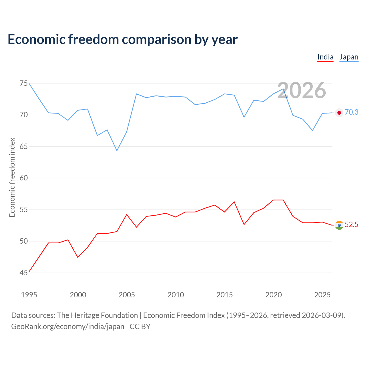 The Economic Freedom Index for India is 52.5, ranking 146/197, compared to 70.3 for Japan, ranking 36/197. The chart above displays a comparison of annual changes in economic freedom indexes.