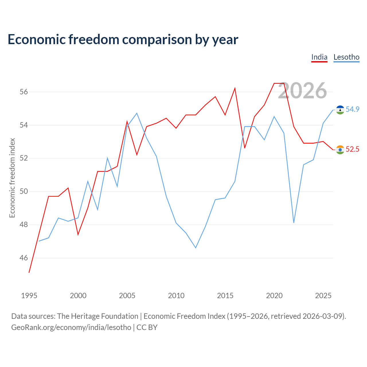 The Economic Freedom Index for India is 52.5, ranking 146/197, compared to 54.9 for Lesotho, ranking 130/197. The chart above displays a comparison of annual changes in economic freedom indexes.