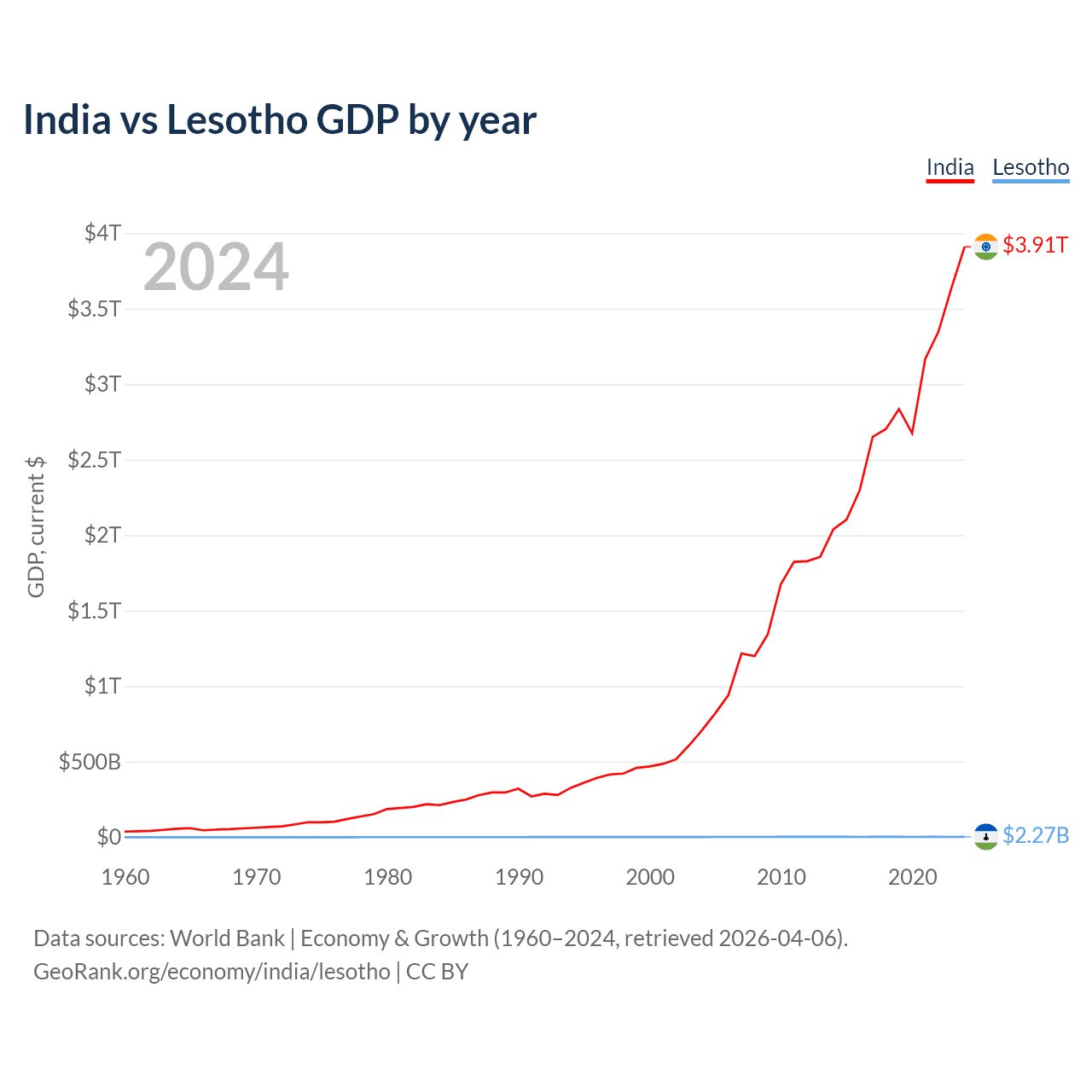 India has a GDP of $3.91T compared to $2.27B for Lesotho, ranking 5/197 and 175/197 by economy size, respectively.