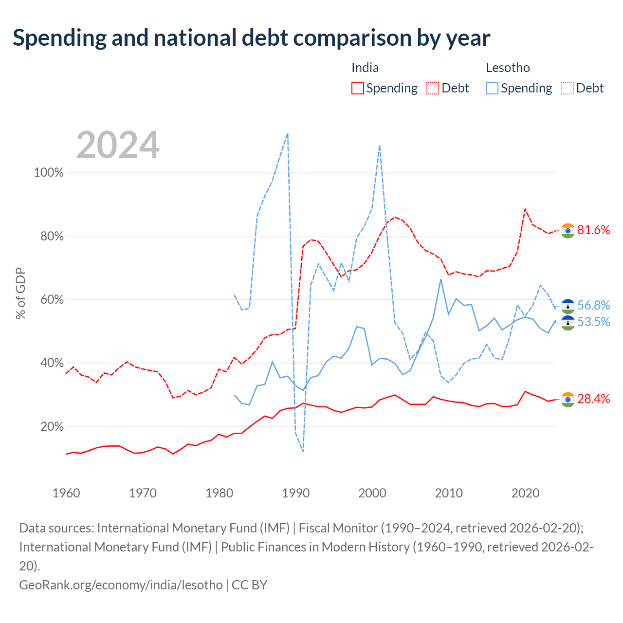 India has $3.19T in government debt (81.6% of GDP), compared to $1.29B (56.8% of GDP) in Lesotho.