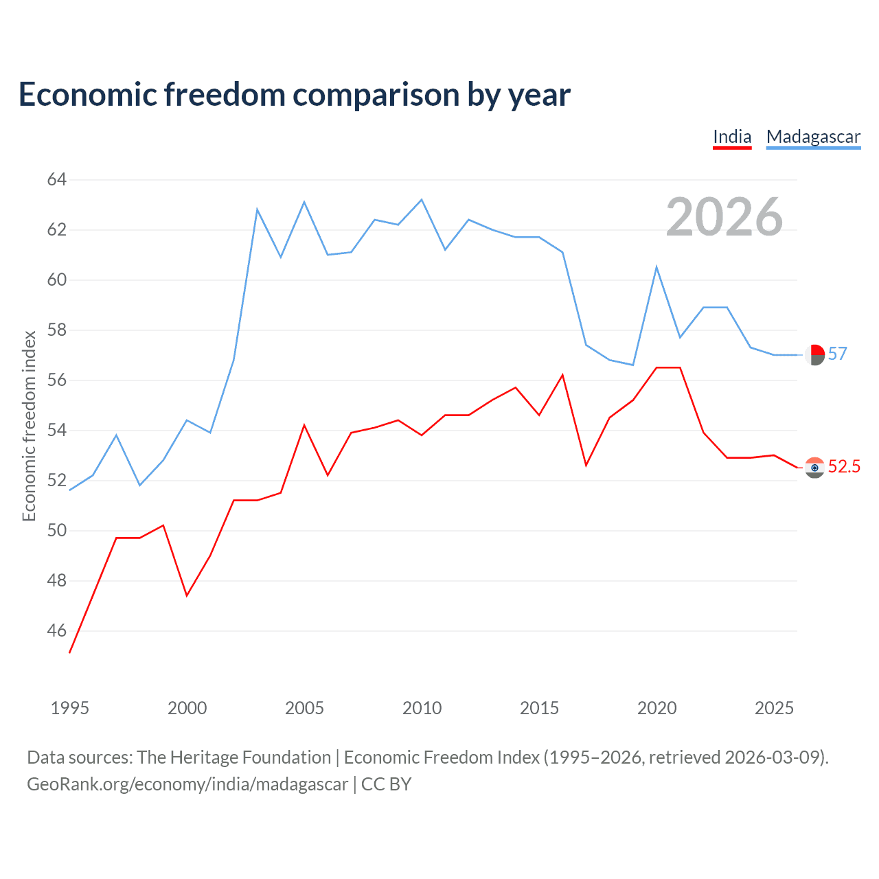 The Economic Freedom Index for India is 52.5, ranking 146/197, compared to 57 for Madagascar, ranking 119/197. The chart above displays a comparison of annual changes in economic freedom indexes.