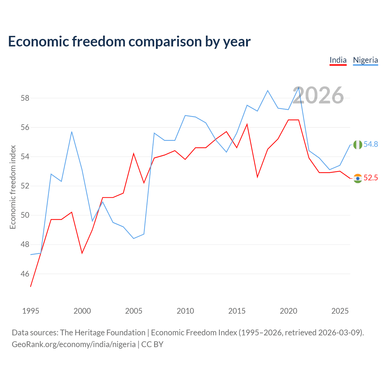 The Economic Freedom Index for India is 52.5, ranking 146/197, compared to 54.8 for Nigeria, ranking 132/197. The chart above displays a comparison of annual changes in economic freedom indexes.