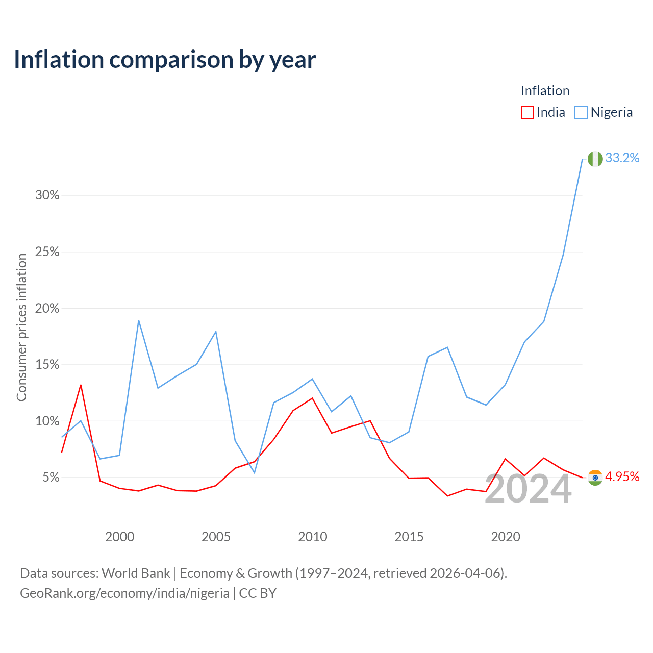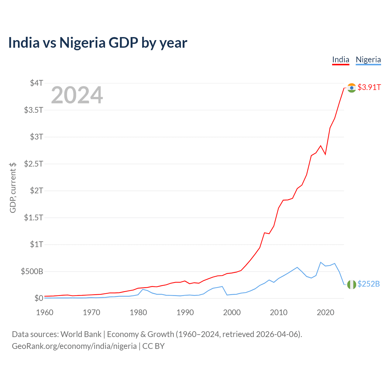 India has a GDP of $3.91T compared to $252B for Nigeria, ranking 5/197 and 54/197 by economy size, respectively.