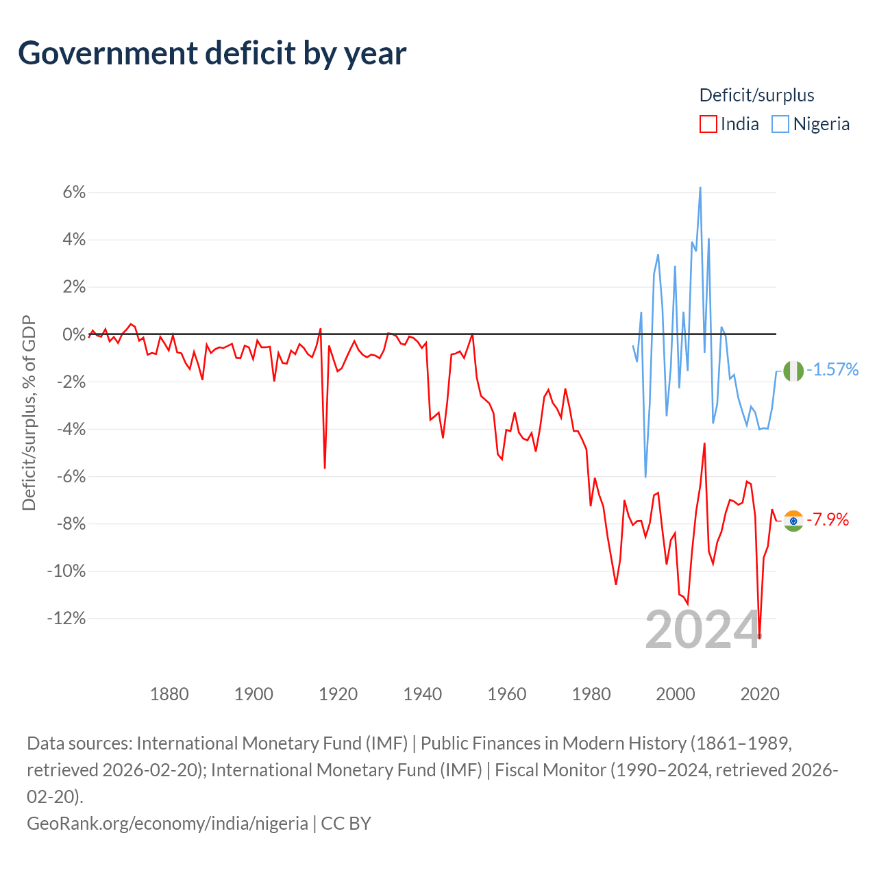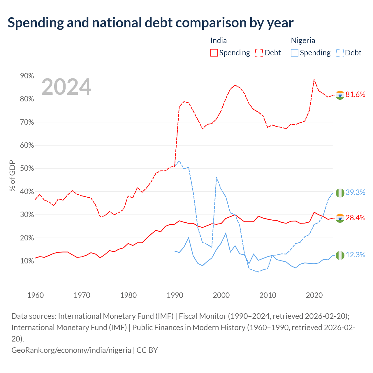 India has $3.19T in government debt (81.6% of GDP), compared to $99.2B (39.3% of GDP) in Nigeria.