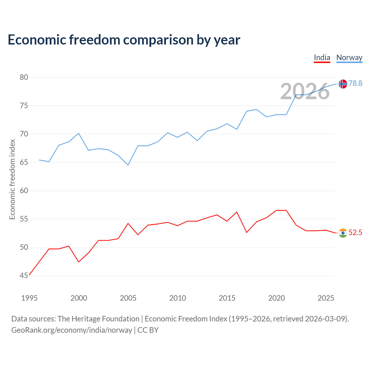 The Economic Freedom Index for India is 52.5, ranking 146/197, compared to 78.8 for Norway, ranking 9/197. The chart above displays a comparison of annual changes in economic freedom indexes.