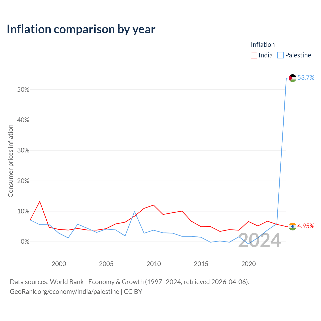 India has a GDP of $3.91T compared to $13.7B for Palestine, ranking 5/197 and 146/197 by economy size, respectively.