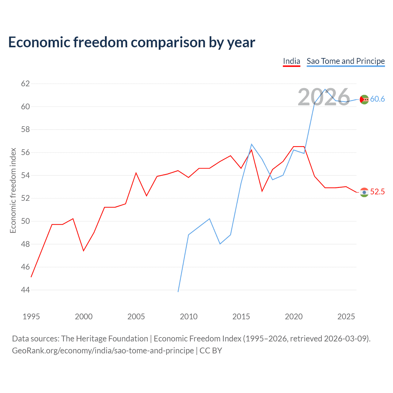 The Economic Freedom Index for India is 53, ranking 143/197, compared to 60.4 for Sao Tome and Principe, ranking 93/197. The chart below displays a comparison of annual changes in economic freedom indexes.