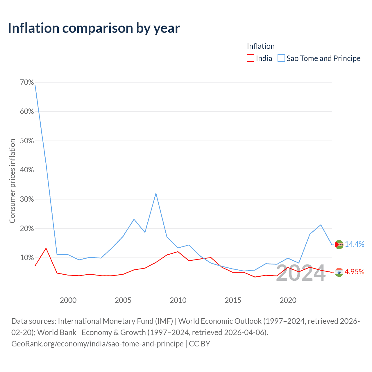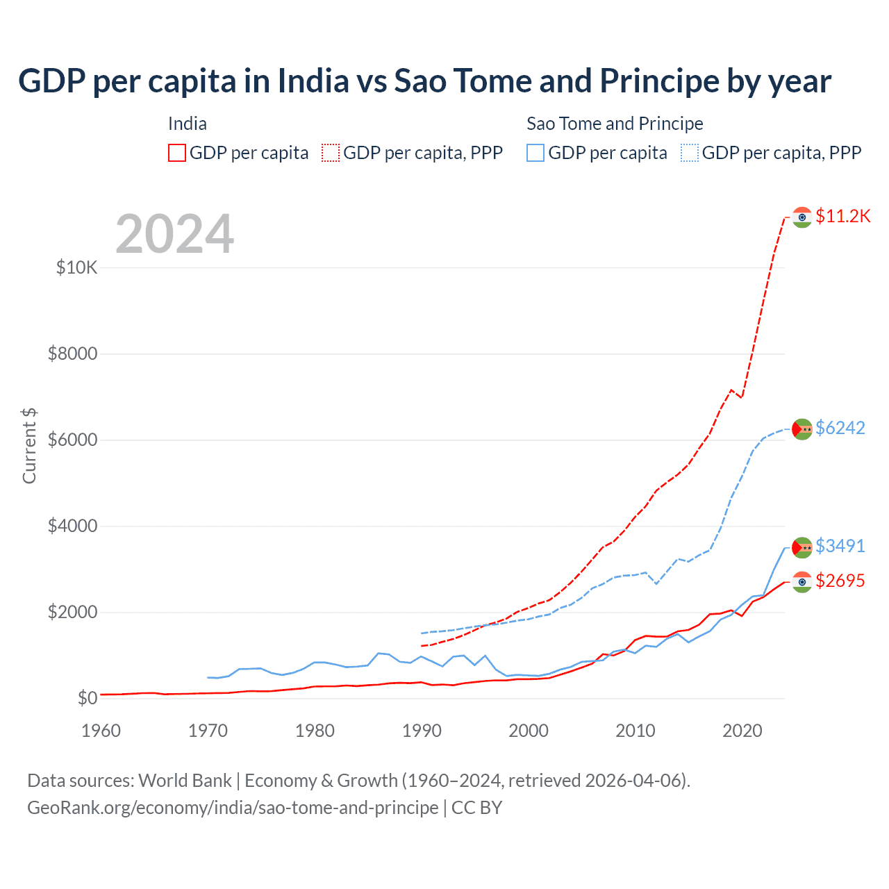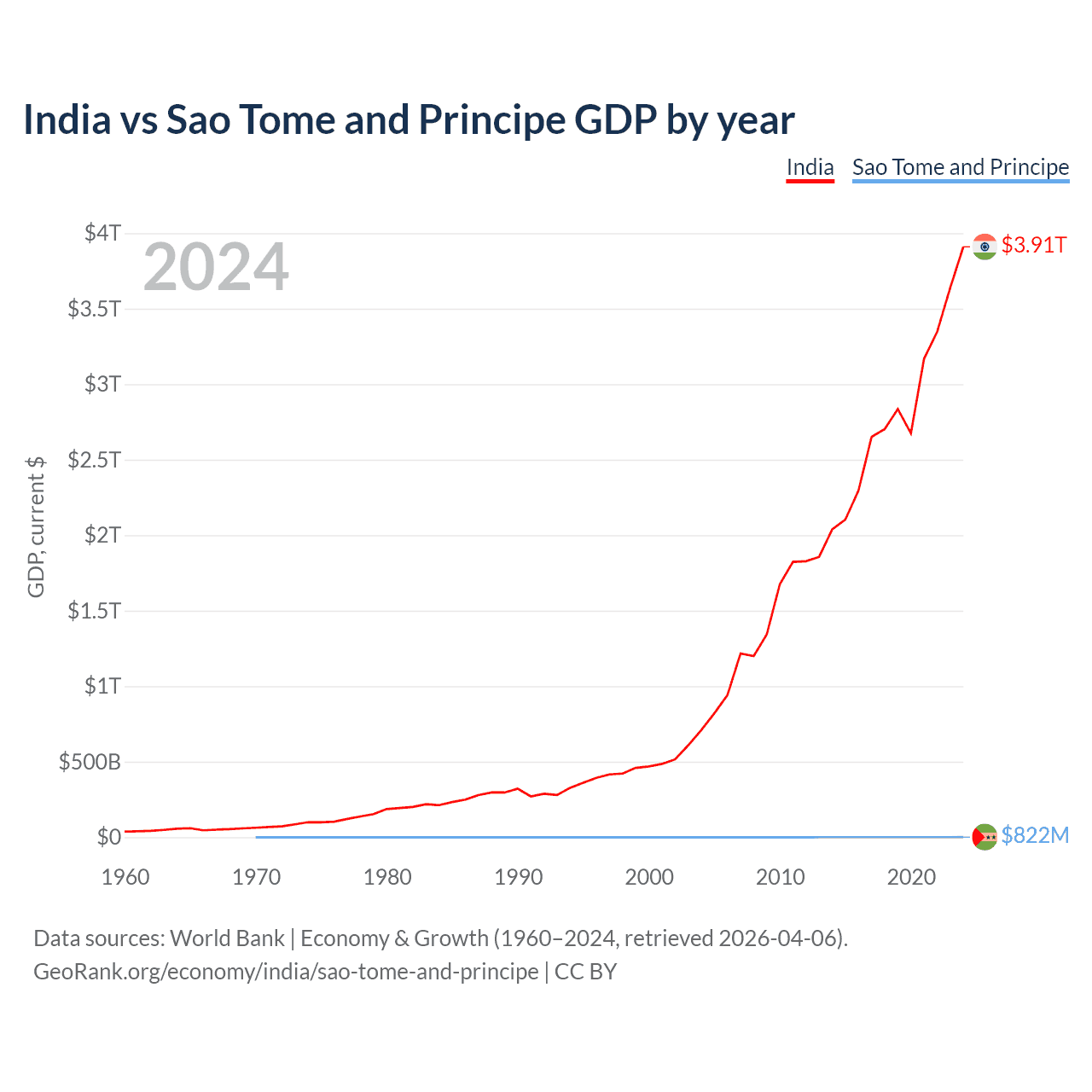 India has a GDP of $3.91T compared to $822M for Sao Tome and Principe, ranking 5/197 and 189/197 by economy size, respectively.