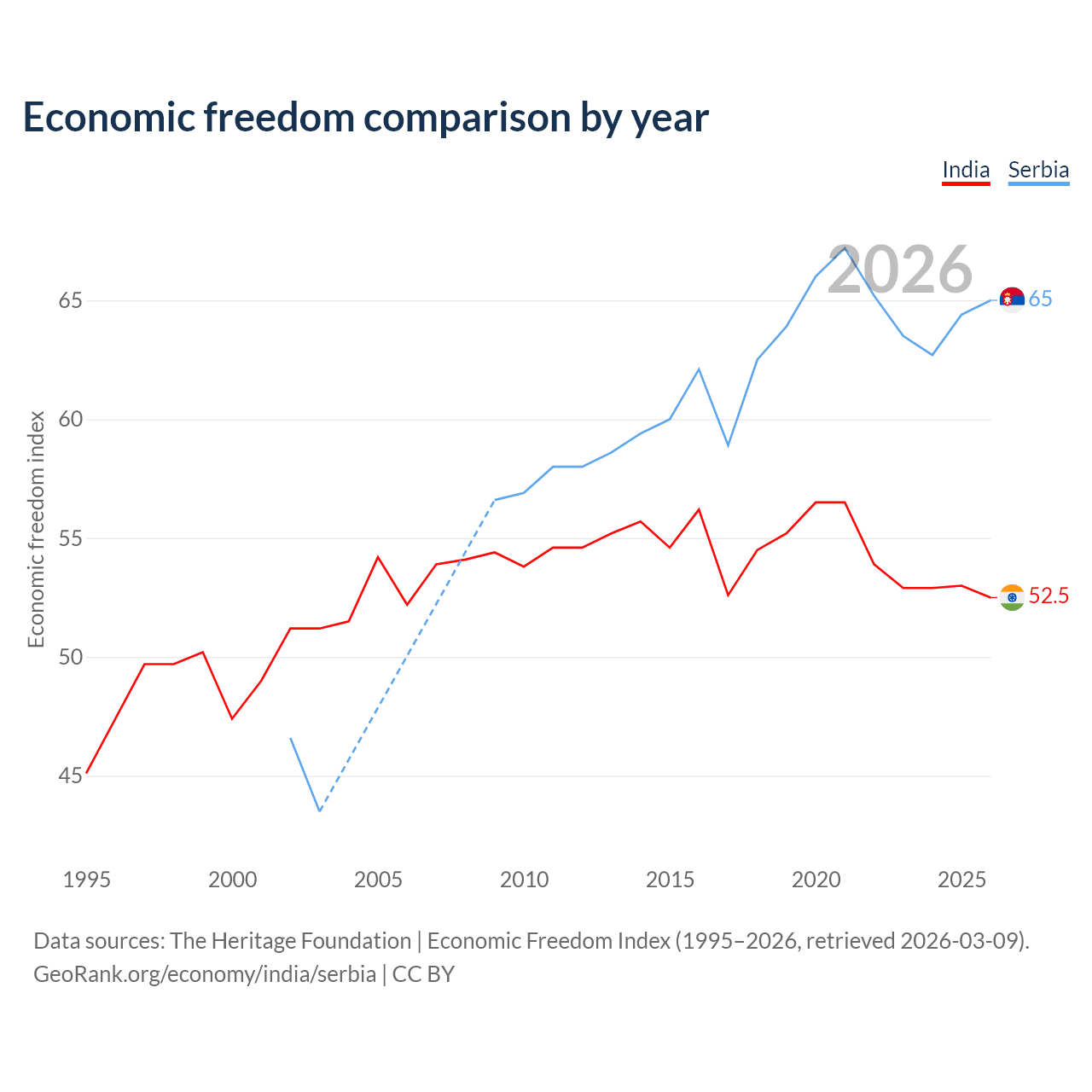 The Economic Freedom Index for India is 52.5, ranking 146/197, compared to 65 for Serbia, ranking 68/197. The chart above displays a comparison of annual changes in economic freedom indexes.