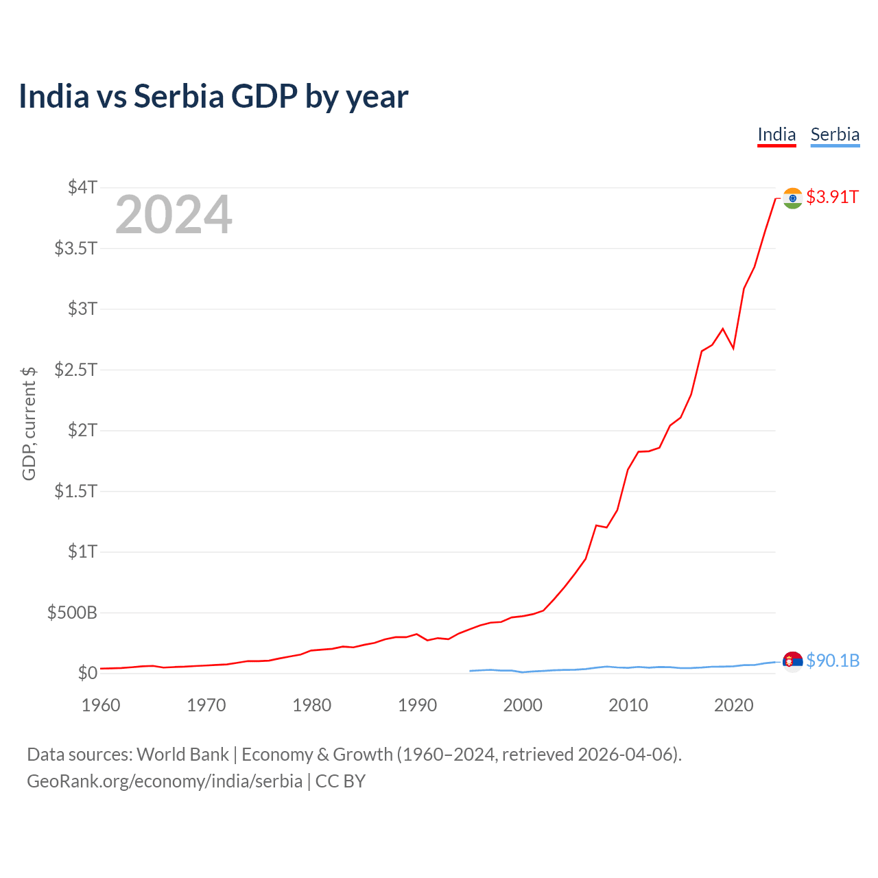 India has a GDP of $3.91T compared to $90.1B for Serbia, ranking 5/197 and 76/197 by economy size, respectively.