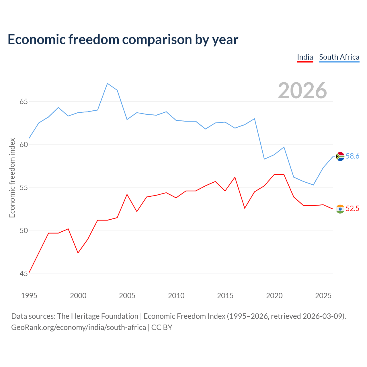 The Economic Freedom Index for India is 52.5, ranking 146/197, compared to 58.6 for South Africa, ranking 110/197. The chart above displays a comparison of annual changes in economic freedom indexes.