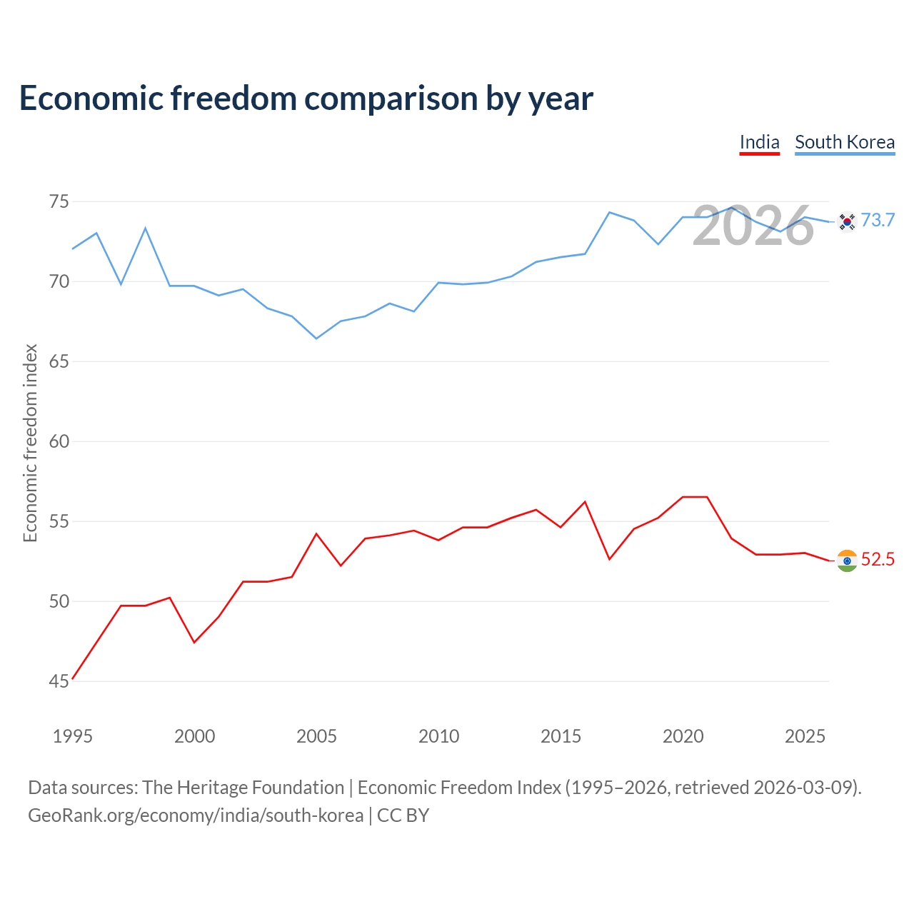 The Economic Freedom Index for India is 52.5, ranking 146/197, compared to 73.7 for South Korea, ranking 24/197. The chart above displays a comparison of annual changes in economic freedom indexes.