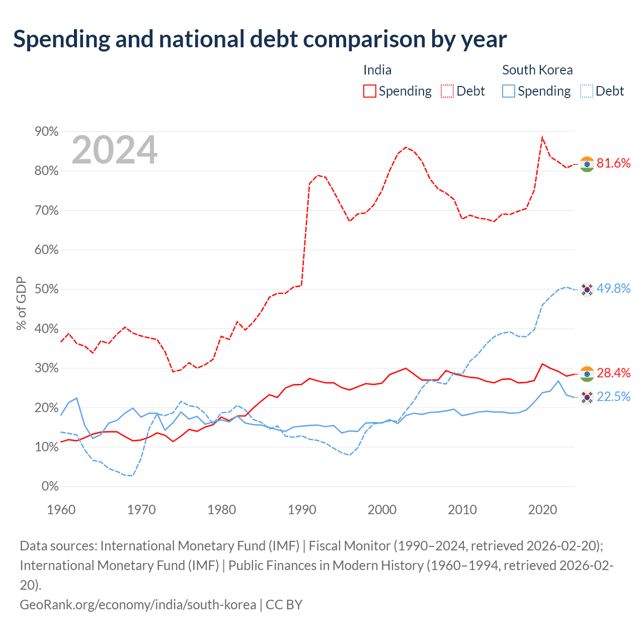 India has $3.19T in government debt (81.6% of GDP), compared to $934B (49.8% of GDP) in South Korea.