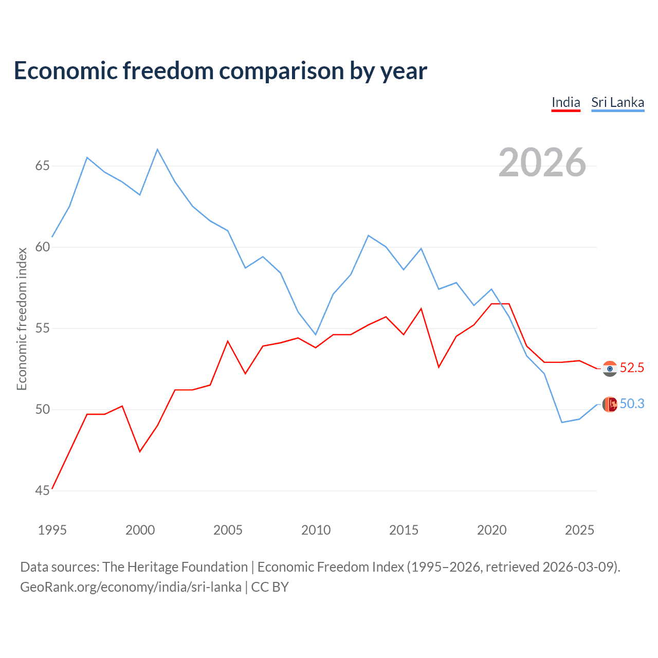 The Economic Freedom Index for India is 52.5, ranking 146/197, compared to 50.3 for Sri Lanka, ranking 162/197. The chart above displays a comparison of annual changes in economic freedom indexes.