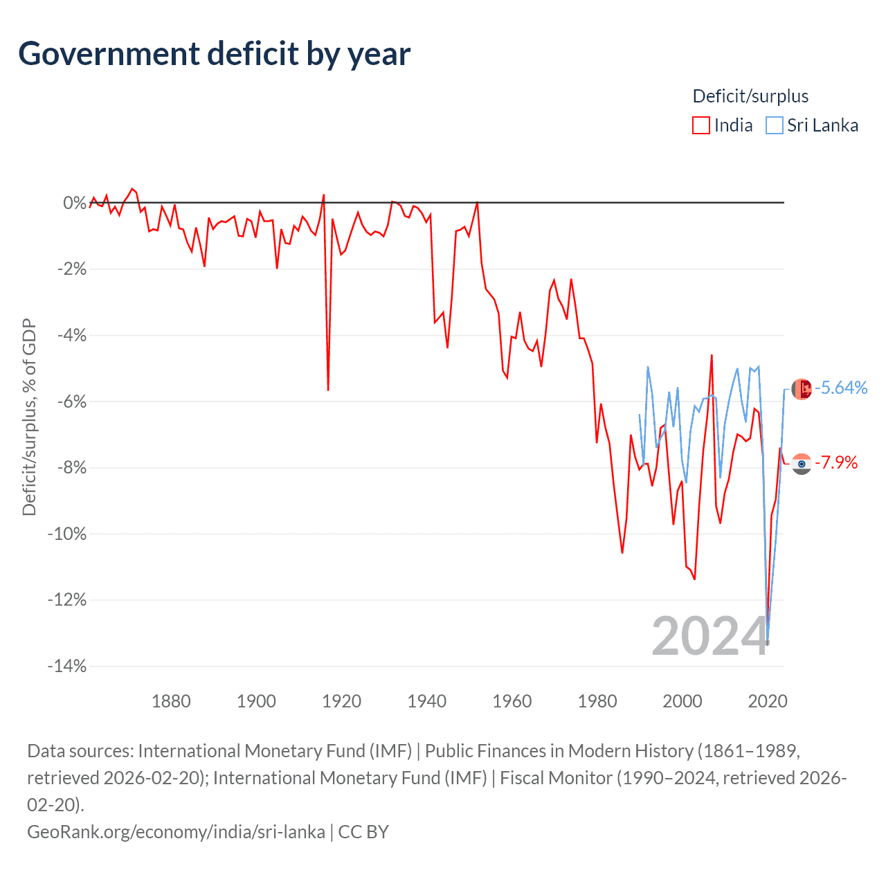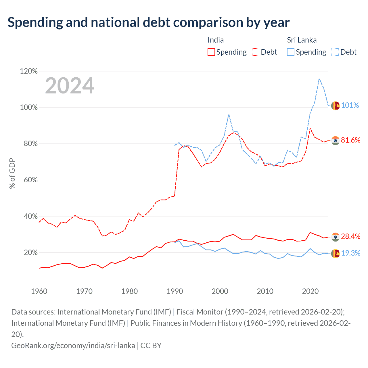 India has $3.19T in government debt (81.6% of GDP), compared to $99.8B (100.8% of GDP) in Sri Lanka.