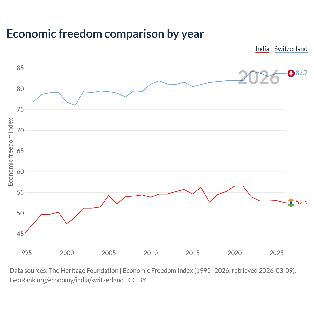 The Economic Freedom Index for India is 52.5, ranking 146/197, compared to 83.7 for Switzerland, ranking 2/197. The chart above displays a comparison of annual changes in economic freedom indexes.