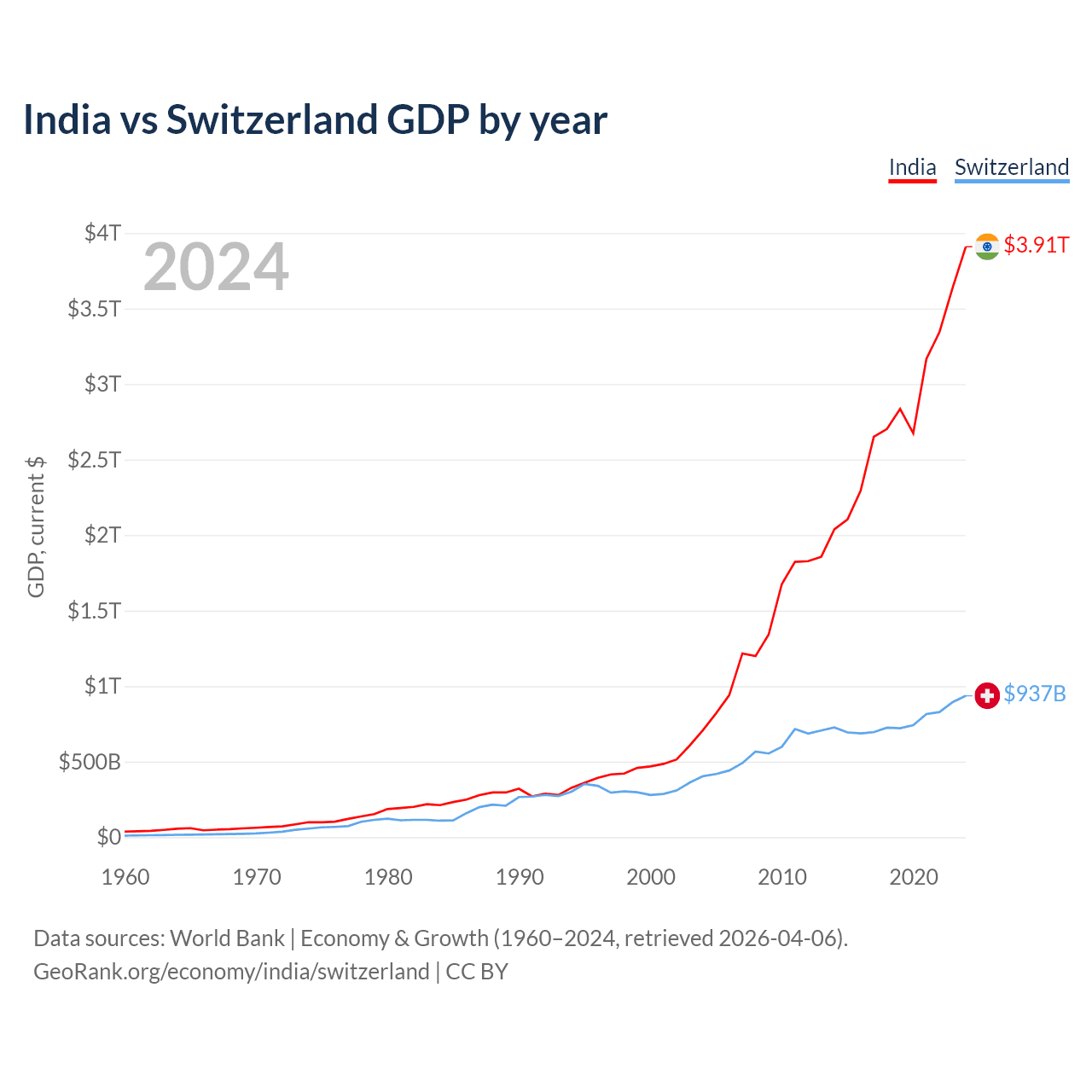 India has a GDP of $3.91T compared to $937B for Switzerland, ranking 5/197 and 20/197 by economy size, respectively.