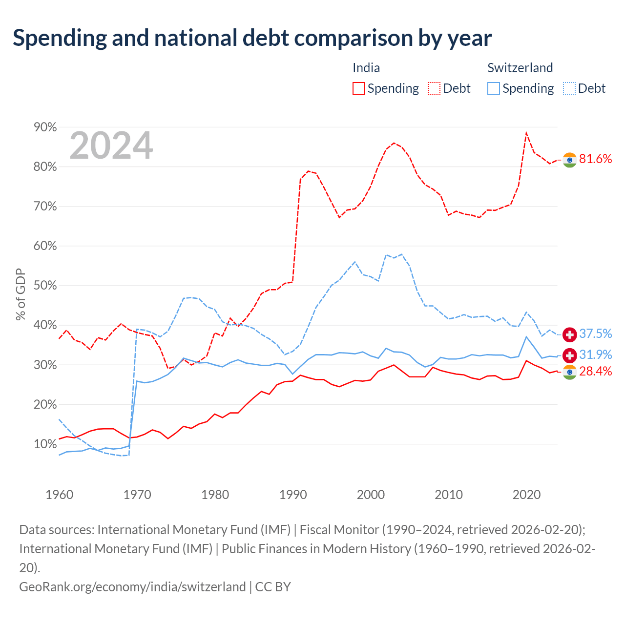 India has $3.19T in government debt (81.6% of GDP), compared to $351B (37.5% of GDP) in Switzerland.