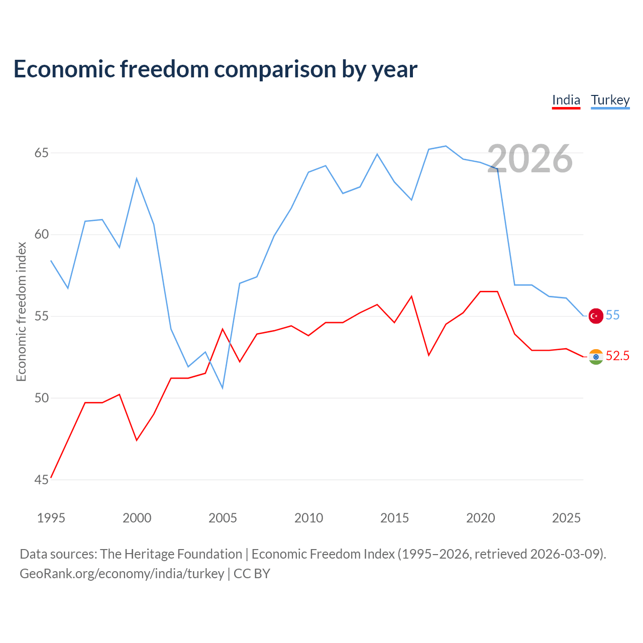 The Economic Freedom Index for India is 52.5, ranking 146/197, compared to 55 for Turkey, ranking 129/197. The chart above displays a comparison of annual changes in economic freedom indexes.