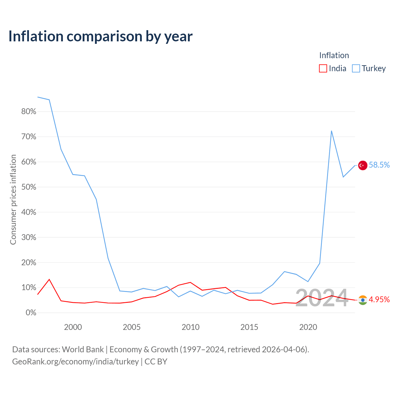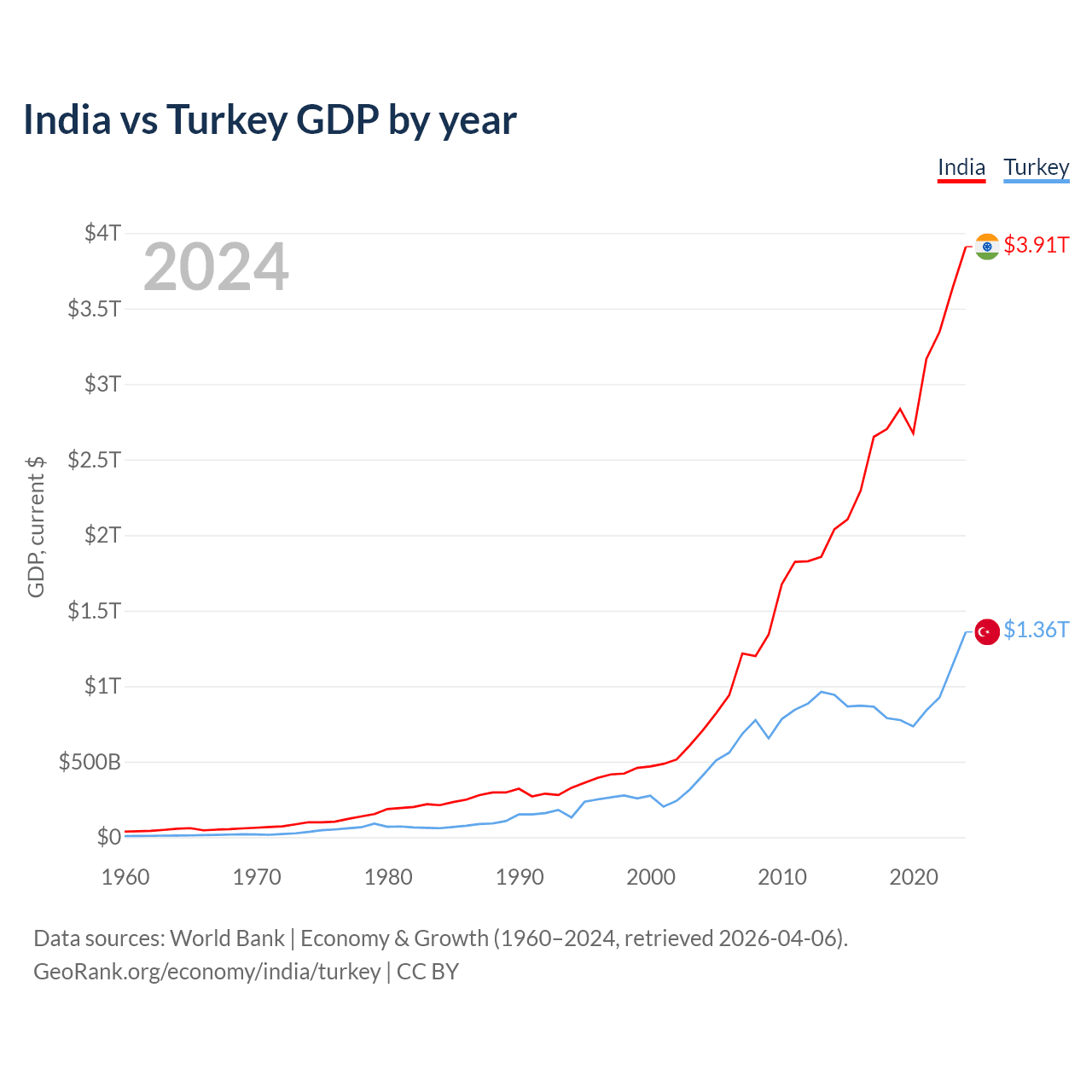 India has a GDP of $3.91T compared to $1.36T for Turkey, ranking 5/197 and 17/197 by economy size, respectively.