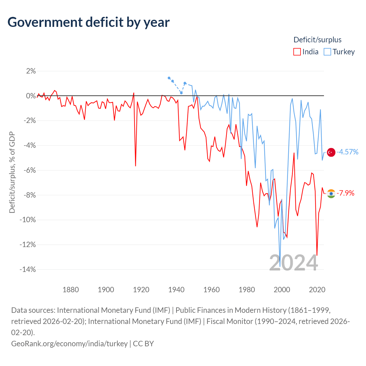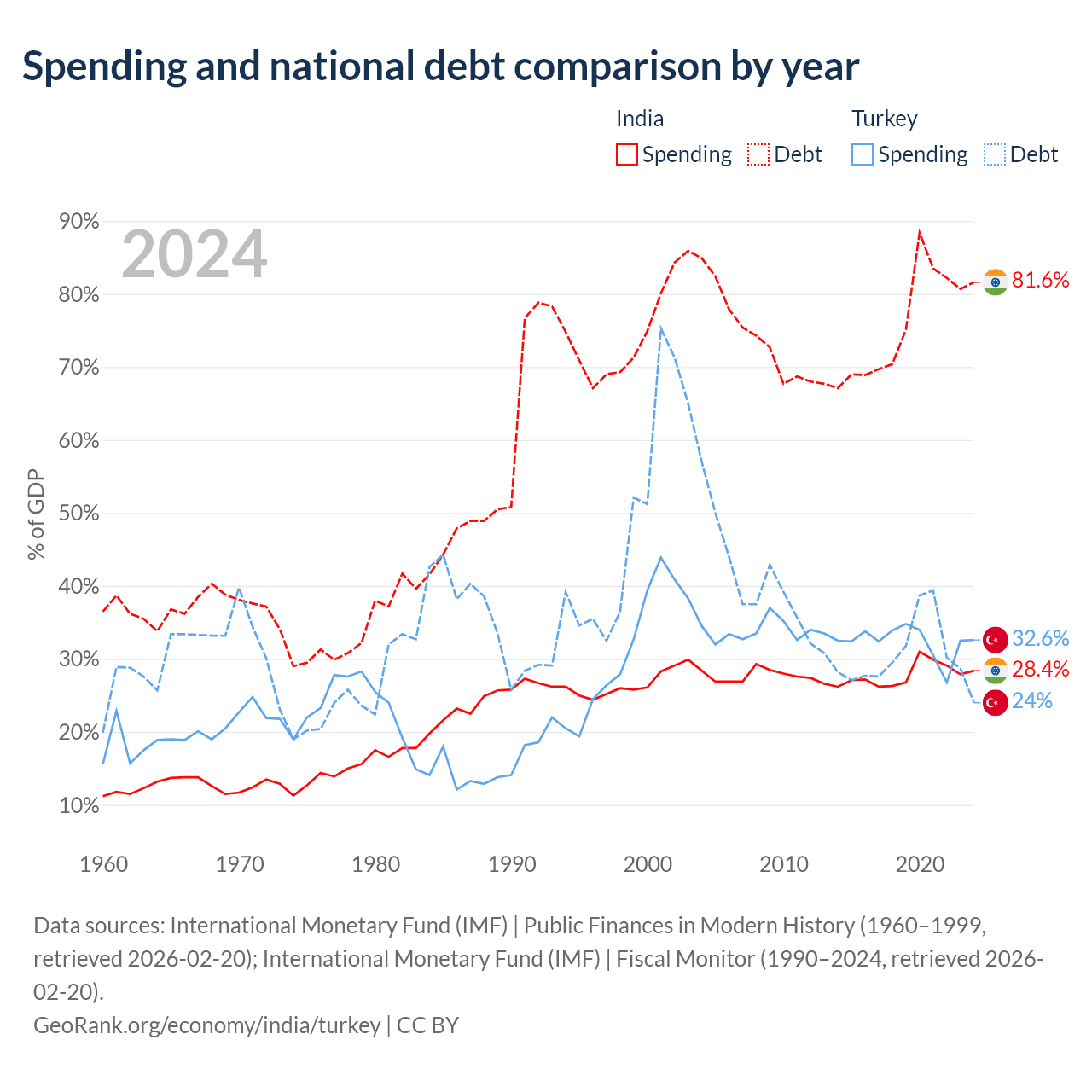 India has $3.19T in government debt (81.6% of GDP), compared to $327B (24% of GDP) in Turkey.