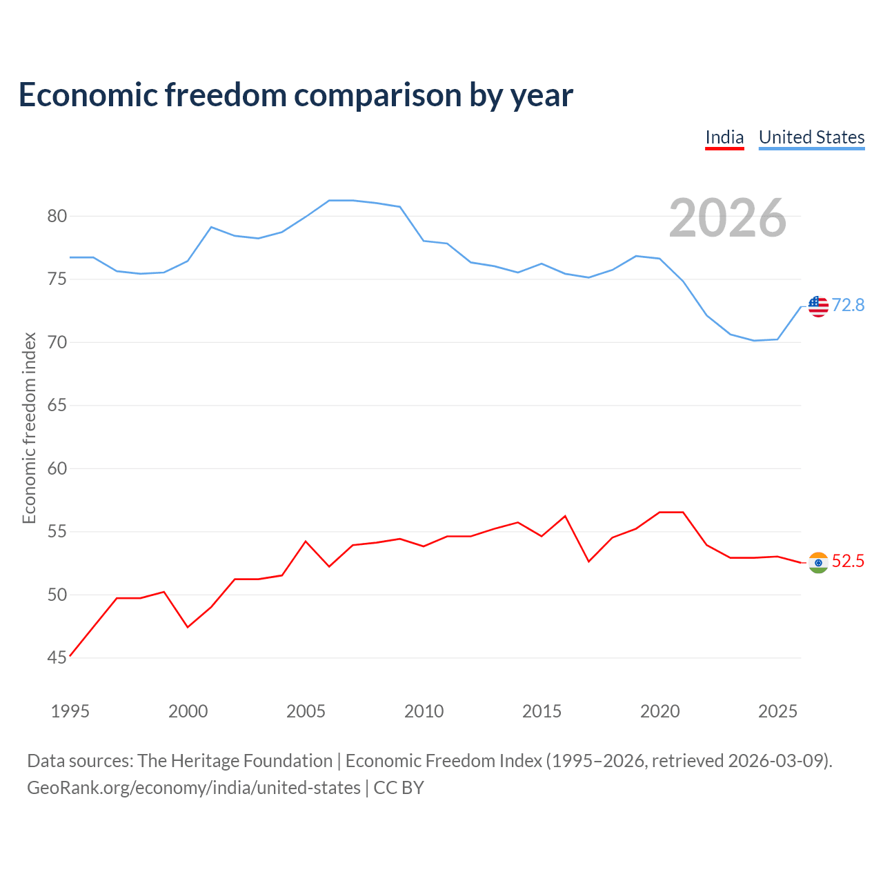 Data sources: The Heritage Foundation | Economic Freedom Index (1995–2026, retrieved 2026-03-09).