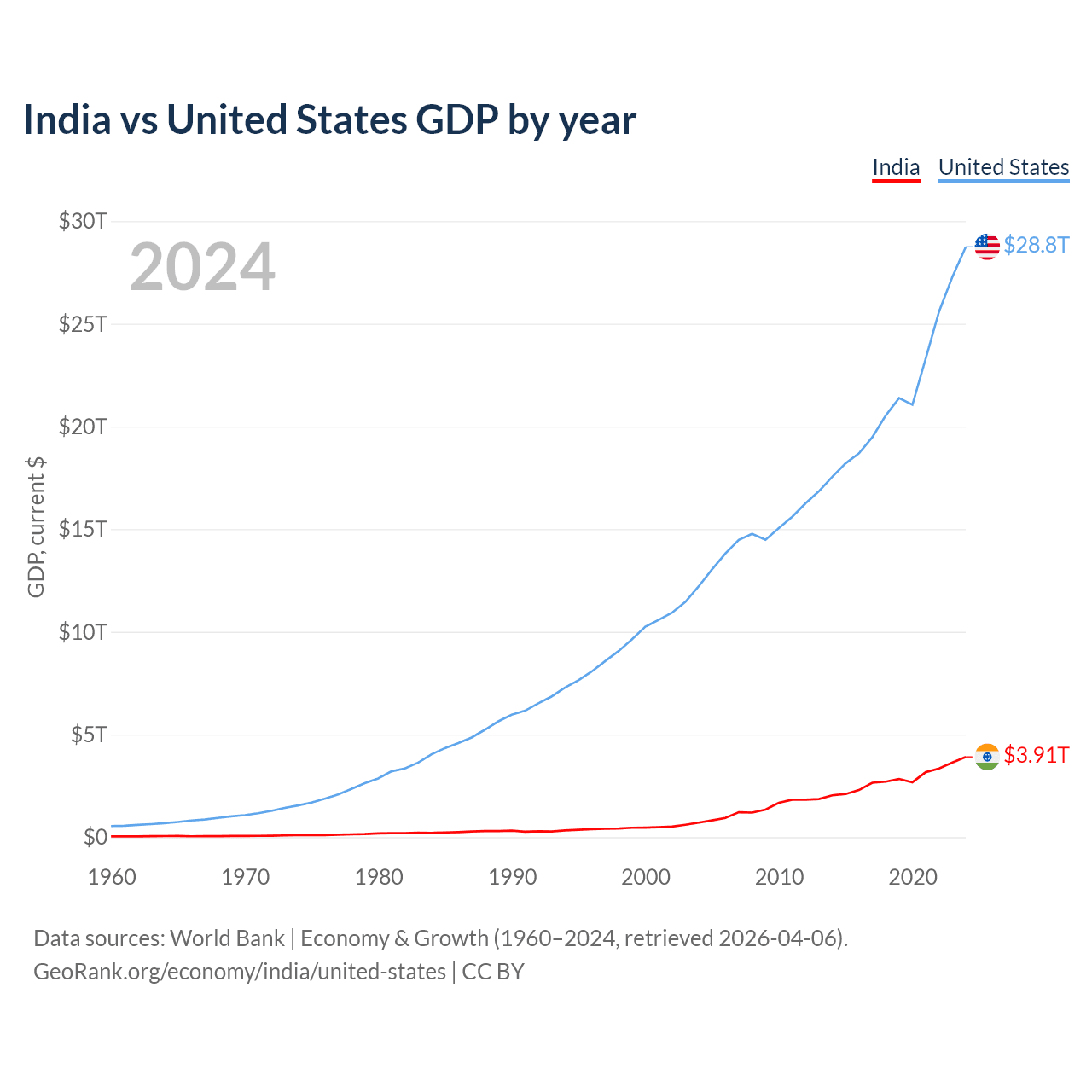 India vs United States GDP by year