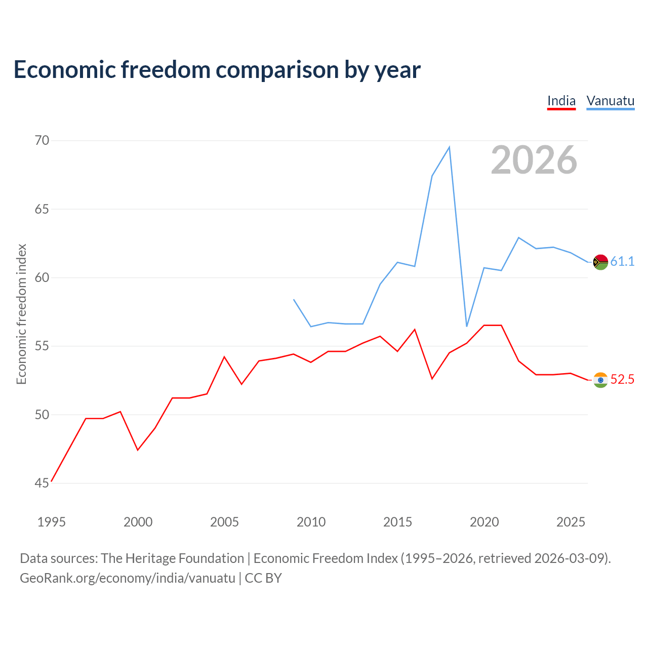 The Economic Freedom Index for India is 52.5, ranking 146/197, compared to 61.1 for Vanuatu, ranking 92/197. The chart above displays a comparison of annual changes in economic freedom indexes.