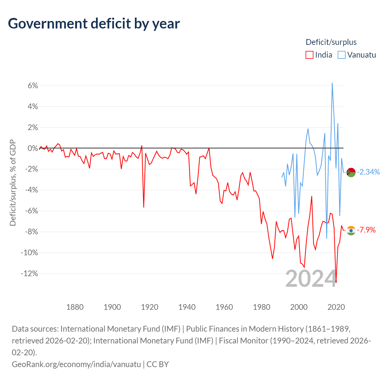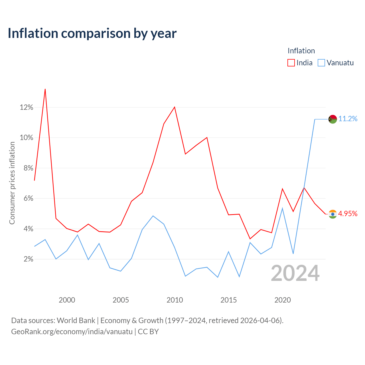 India has a GDP of $3.91T compared to $1.12B for Vanuatu, ranking 5/197 and 188/197 by economy size, respectively.