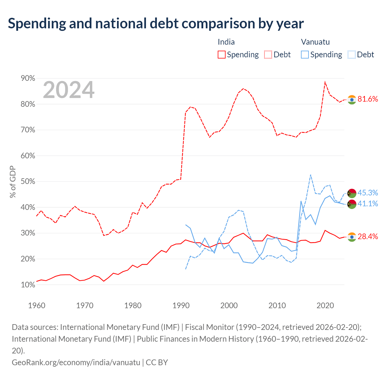 India has $3.19T in government debt (81.6% of GDP), compared to $507M (45.3% of GDP) in Vanuatu.