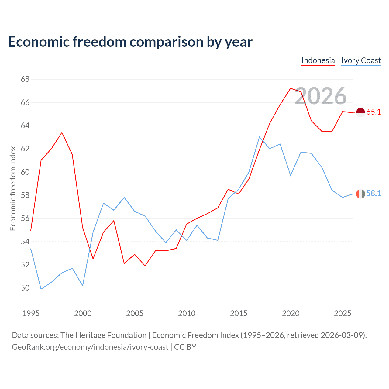 The Economic Freedom Index for Indonesia is 65.1, ranking 67/197, compared to 58.1 for Ivory Coast, ranking 111/197. The chart above displays a comparison of annual changes in economic freedom indexes.