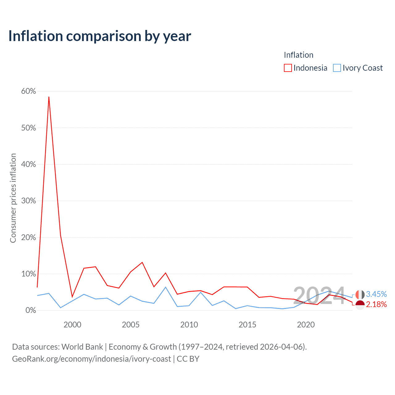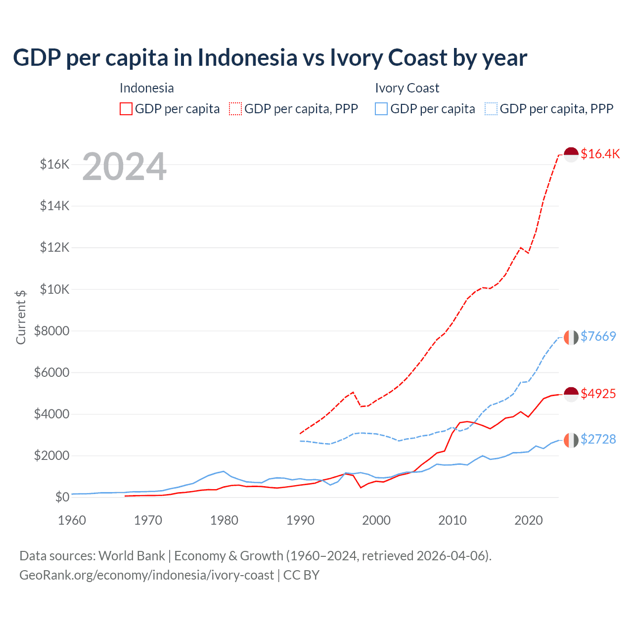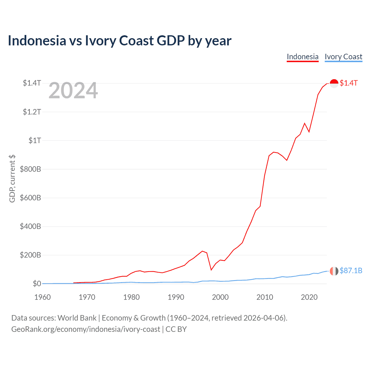 Indonesia has a GDP of $1.4T compared to $87.1B for Ivory Coast, ranking 16/197 and 77/197 by economy size, respectively.