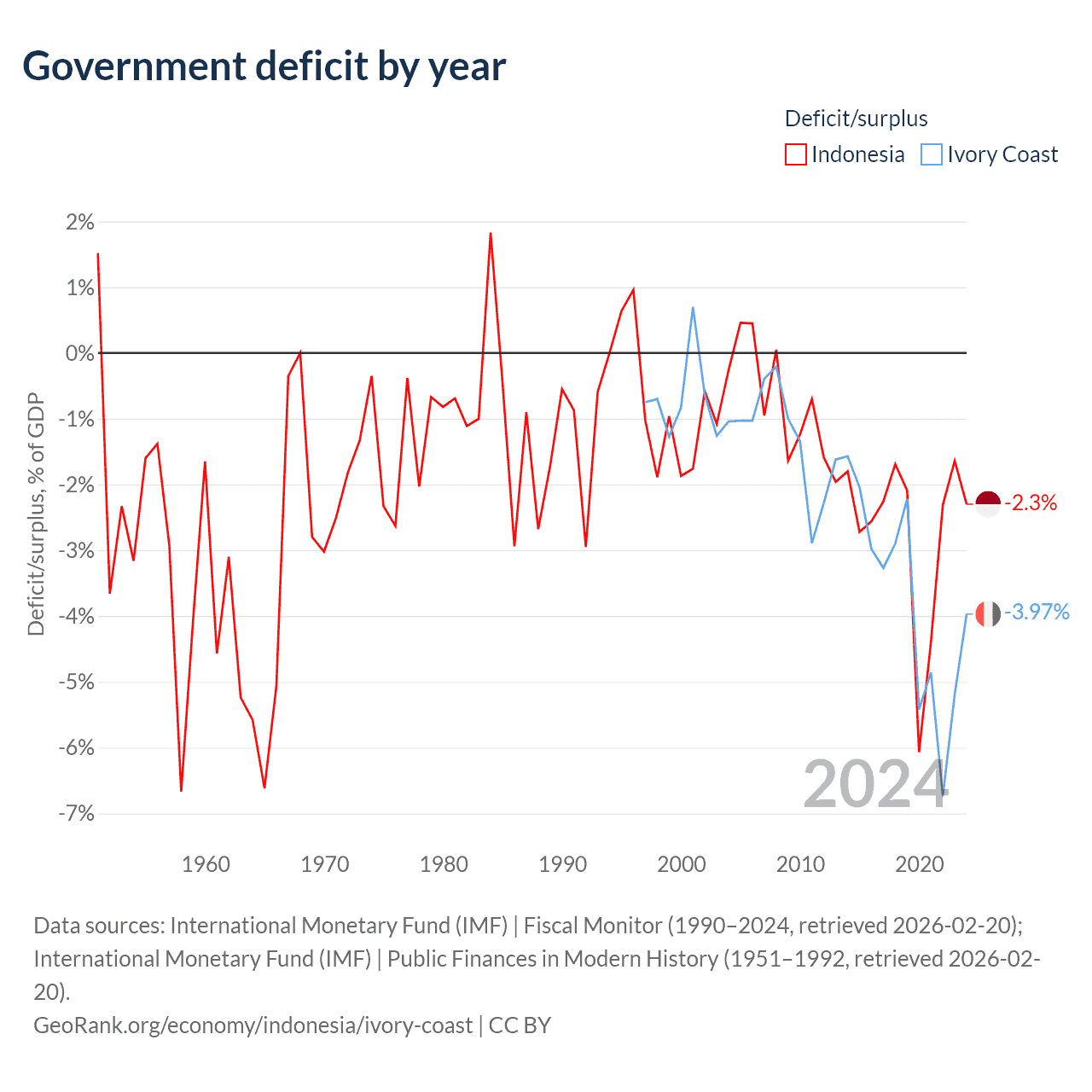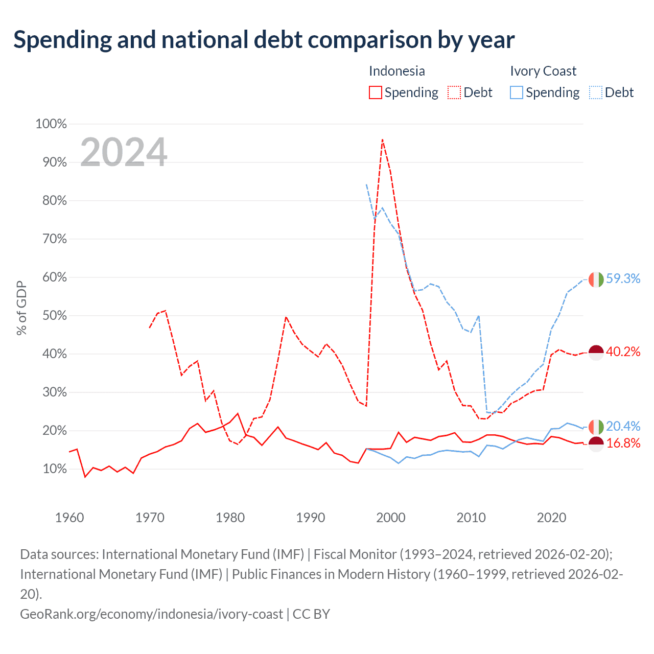 Indonesia has $561B in government debt (40.2% of GDP), compared to $51.6B (59.3% of GDP) in Ivory Coast.