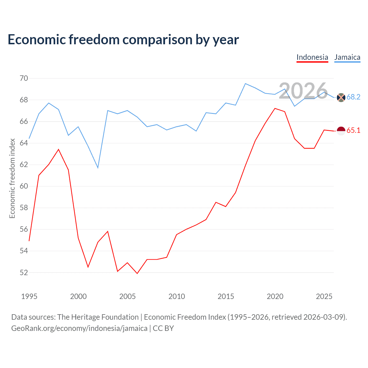 The Economic Freedom Index for Indonesia is 65.1, ranking 67/197, compared to 68.2 for Jamaica, ranking 48/197. The chart above displays a comparison of annual changes in economic freedom indexes.