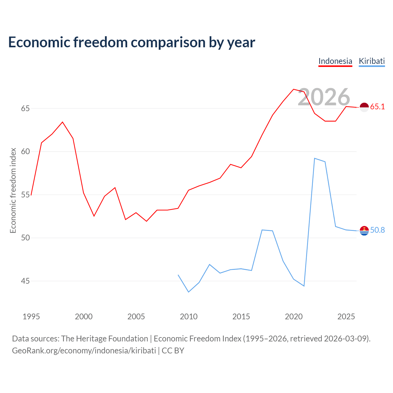 The Economic Freedom Index for Indonesia is 65.1, ranking 67/197, compared to 50.8 for Kiribati, ranking 158/197. The chart above displays a comparison of annual changes in economic freedom indexes.