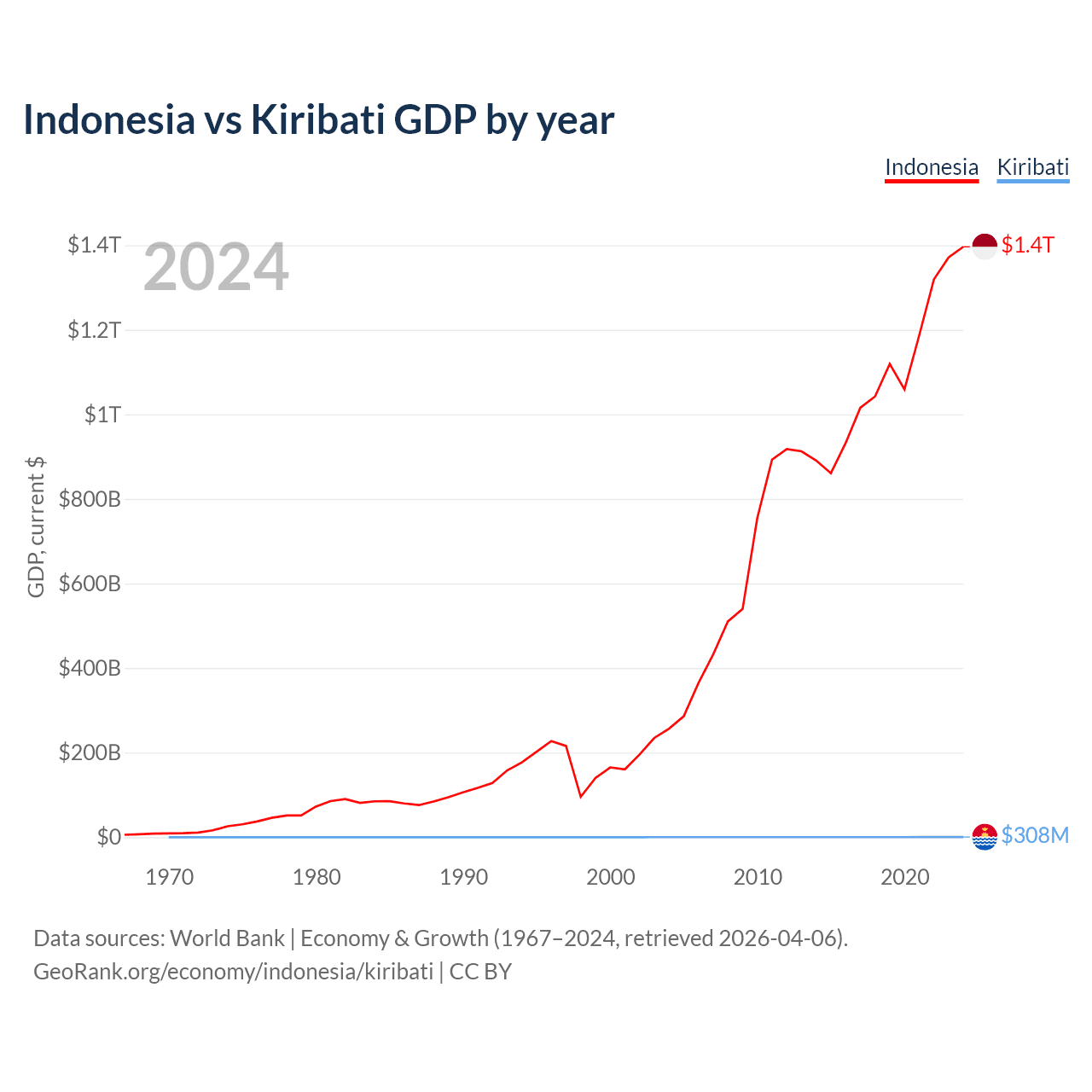 Indonesia has a GDP of $1.4T compared to $308M for Kiribati, ranking 16/197 and 192/197 by economy size, respectively.