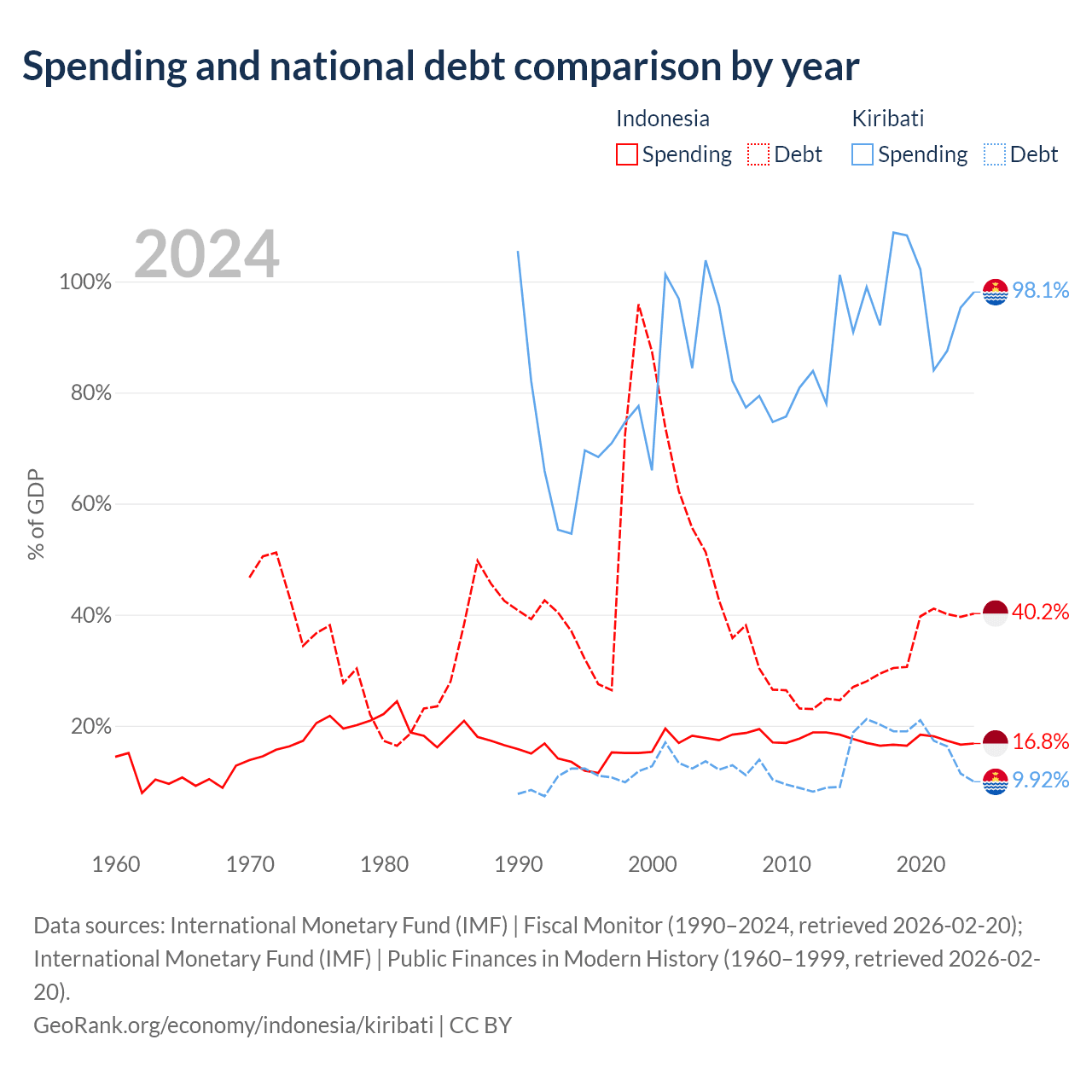 Indonesia has $561B in government debt (40.2% of GDP), compared to $30.5M (9.92% of GDP) in Kiribati.