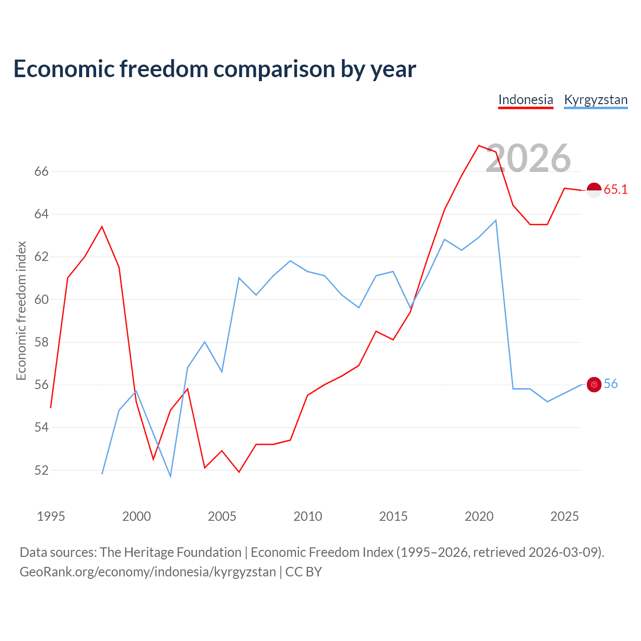 The Economic Freedom Index for Indonesia is 65.1, ranking 67/197, compared to 56 for Kyrgyzstan, ranking 126/197. The chart above displays a comparison of annual changes in economic freedom indexes.