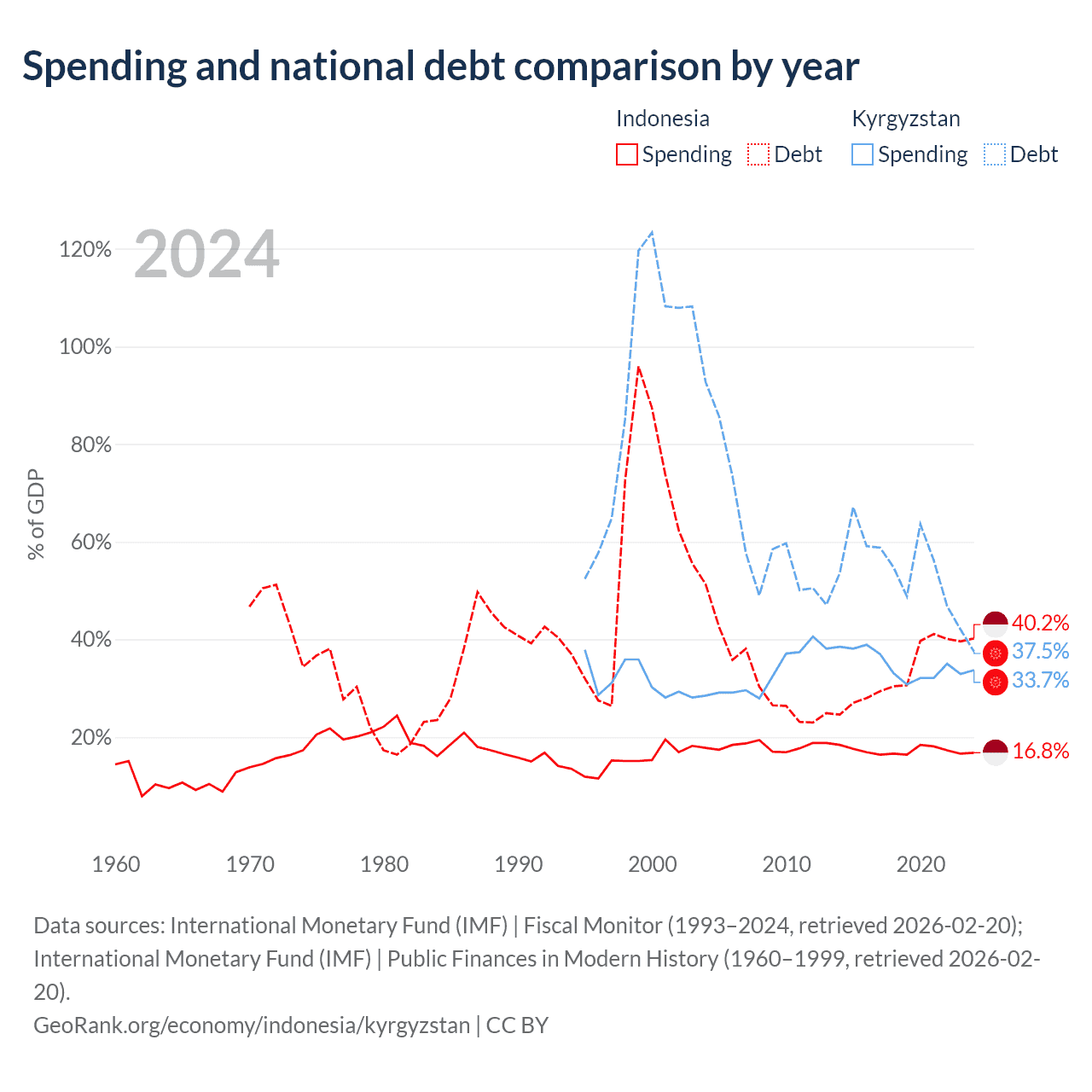 Indonesia has $561B in government debt (40.2% of GDP), compared to $6.56B (37.5% of GDP) in Kyrgyzstan.