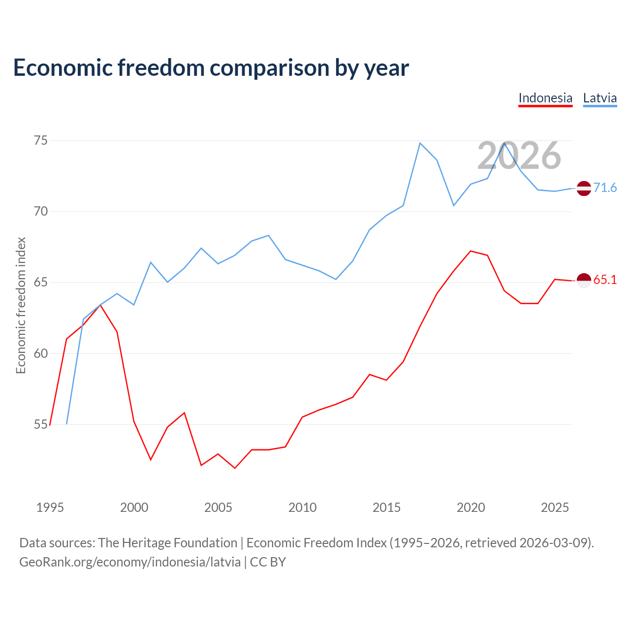 The Economic Freedom Index for Indonesia is 65.1, ranking 67/197, compared to 71.6 for Latvia, ranking 31/197. The chart above displays a comparison of annual changes in economic freedom indexes.