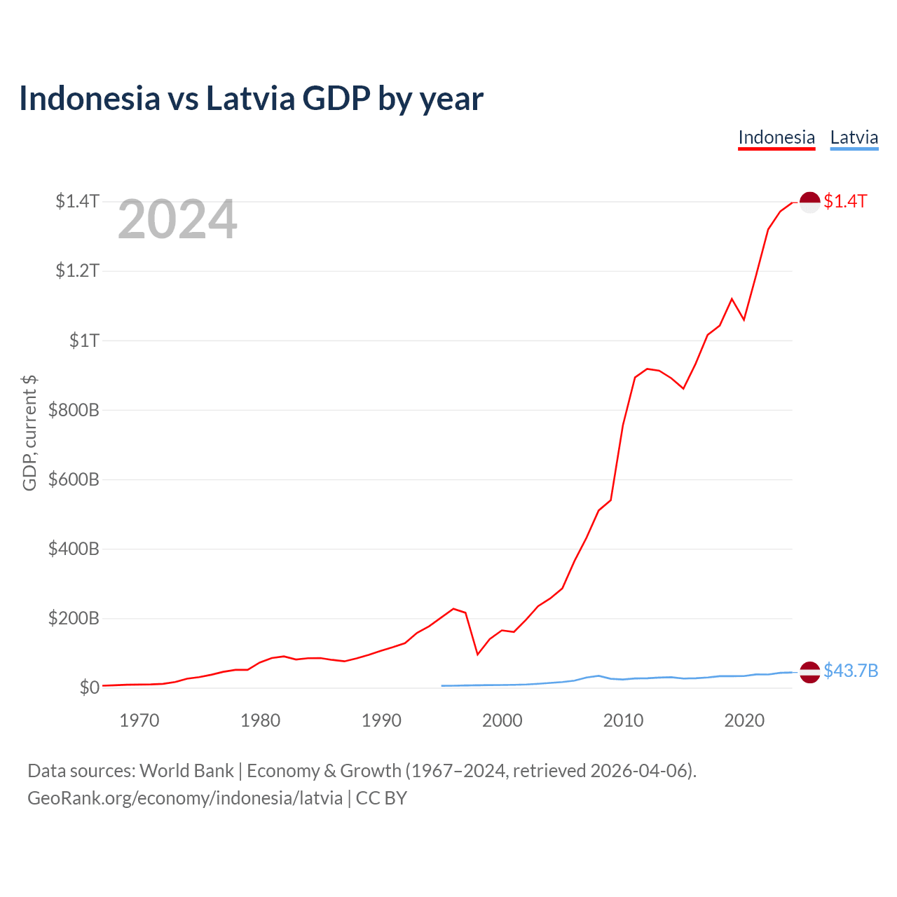 Indonesia has a GDP of $1.4T compared to $43.7B for Latvia, ranking 16/197 and 99/197 by economy size, respectively.