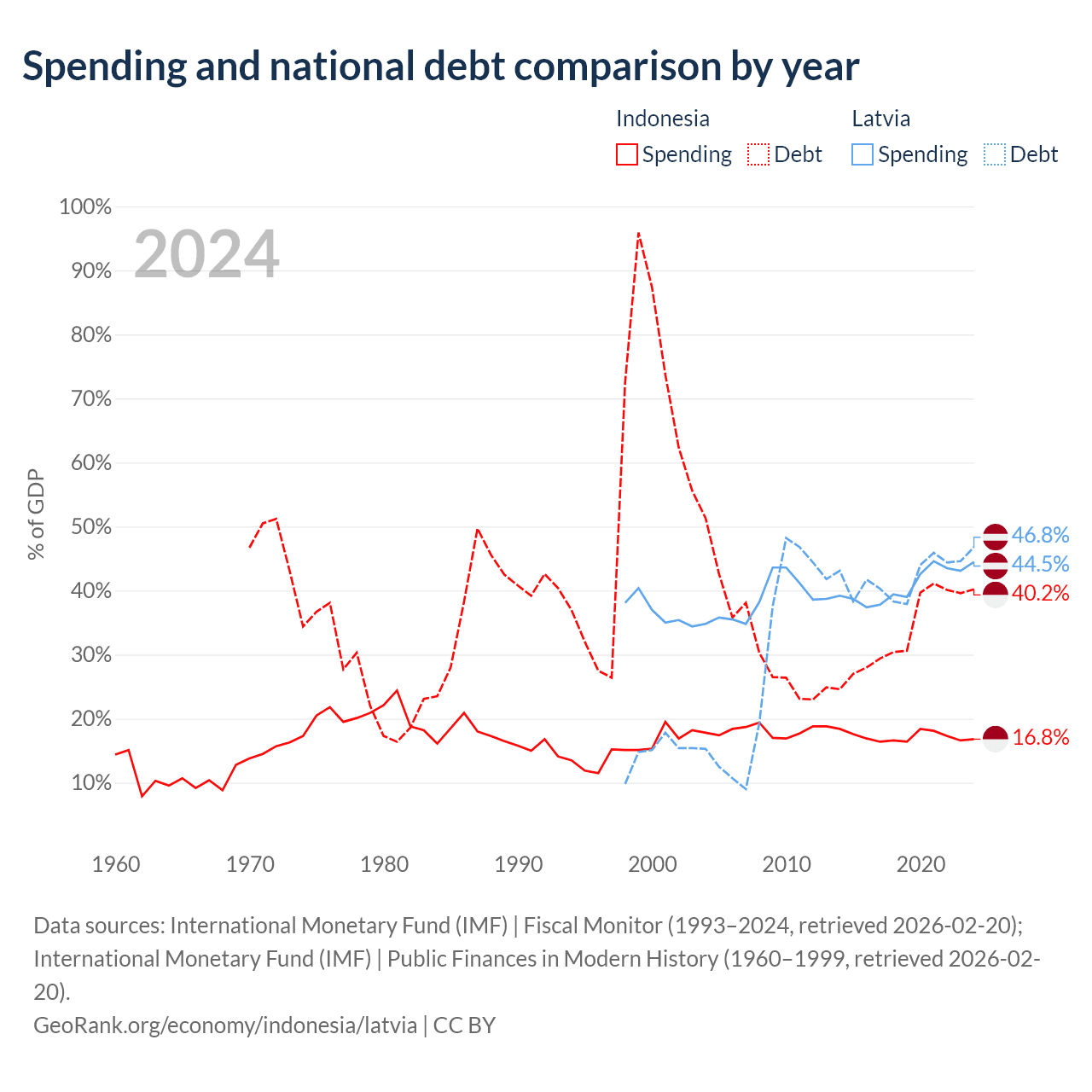 Indonesia has $561B in government debt (40.2% of GDP), compared to $20.4B (46.8% of GDP) in Latvia.