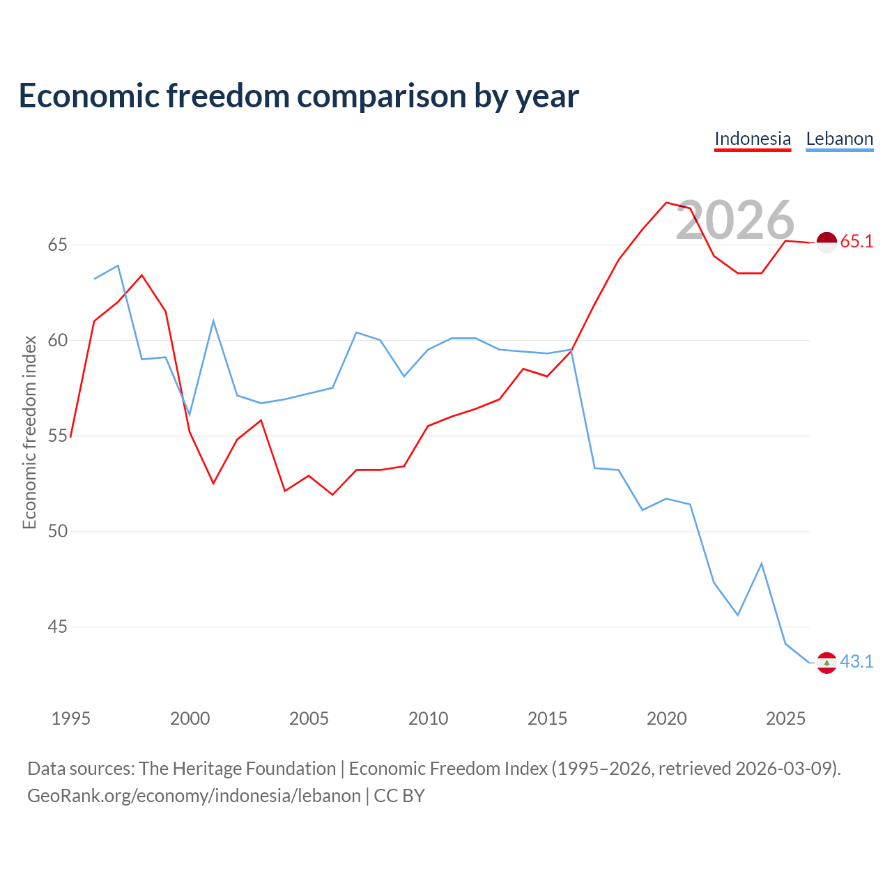 The Economic Freedom Index for Indonesia is 65.1, ranking 67/197, compared to 43.1 for Lebanon, ranking 183/197. The chart above displays a comparison of annual changes in economic freedom indexes.